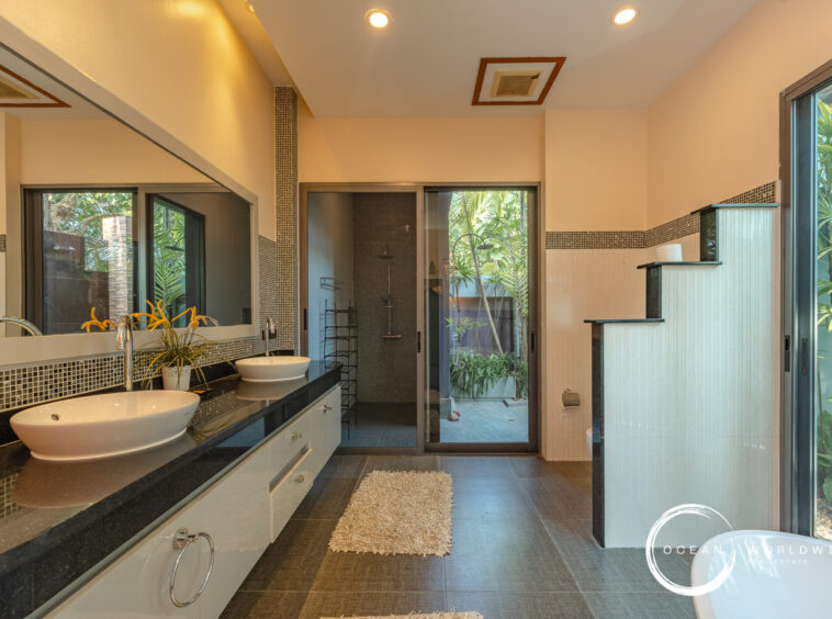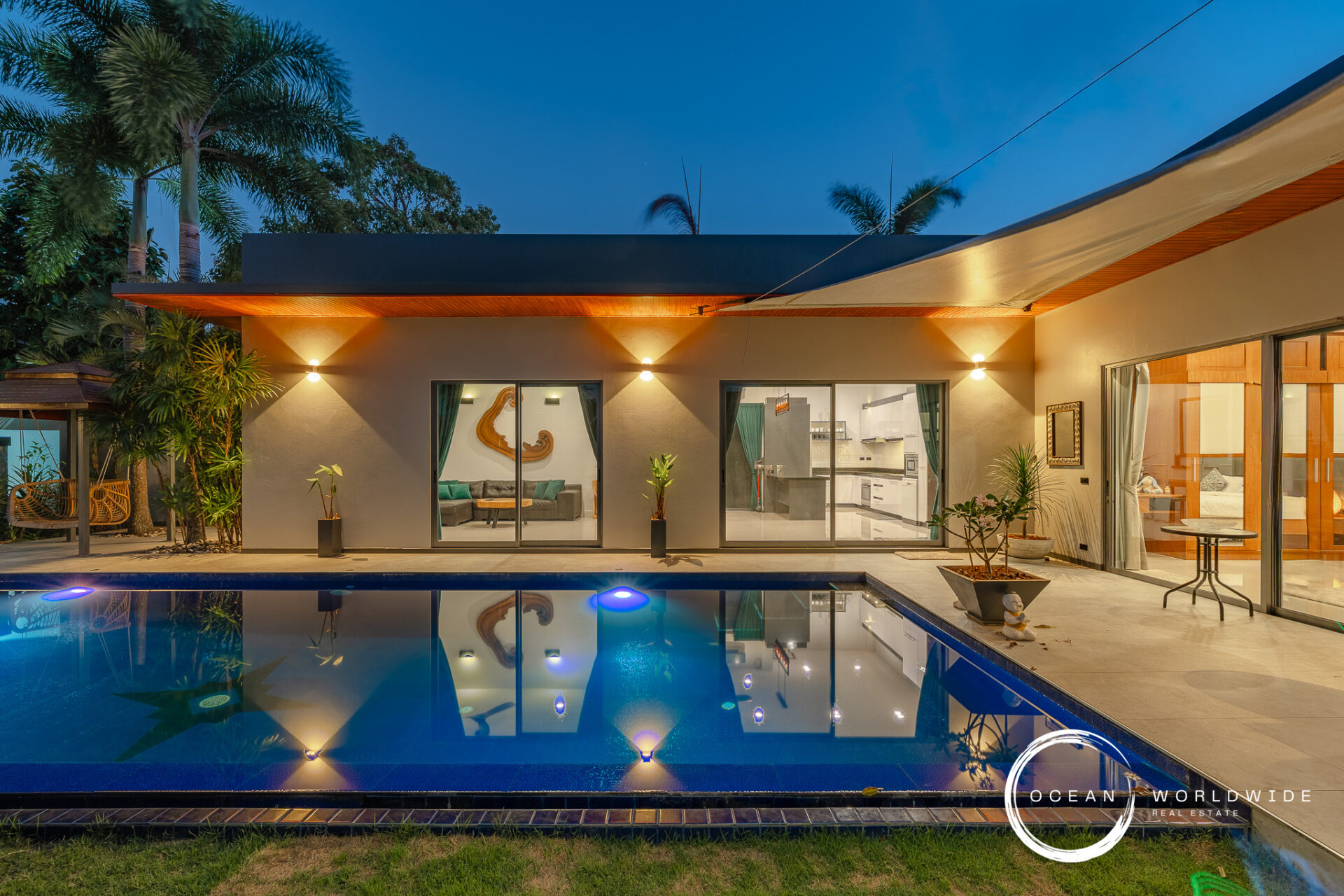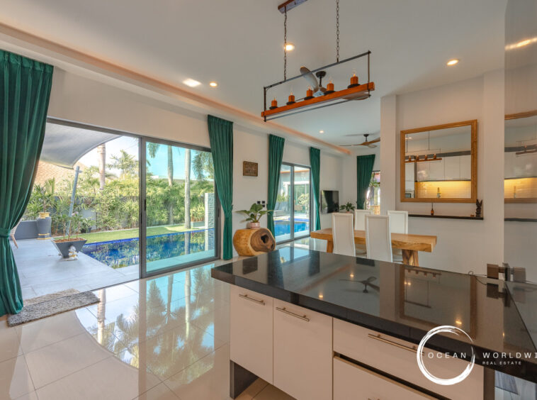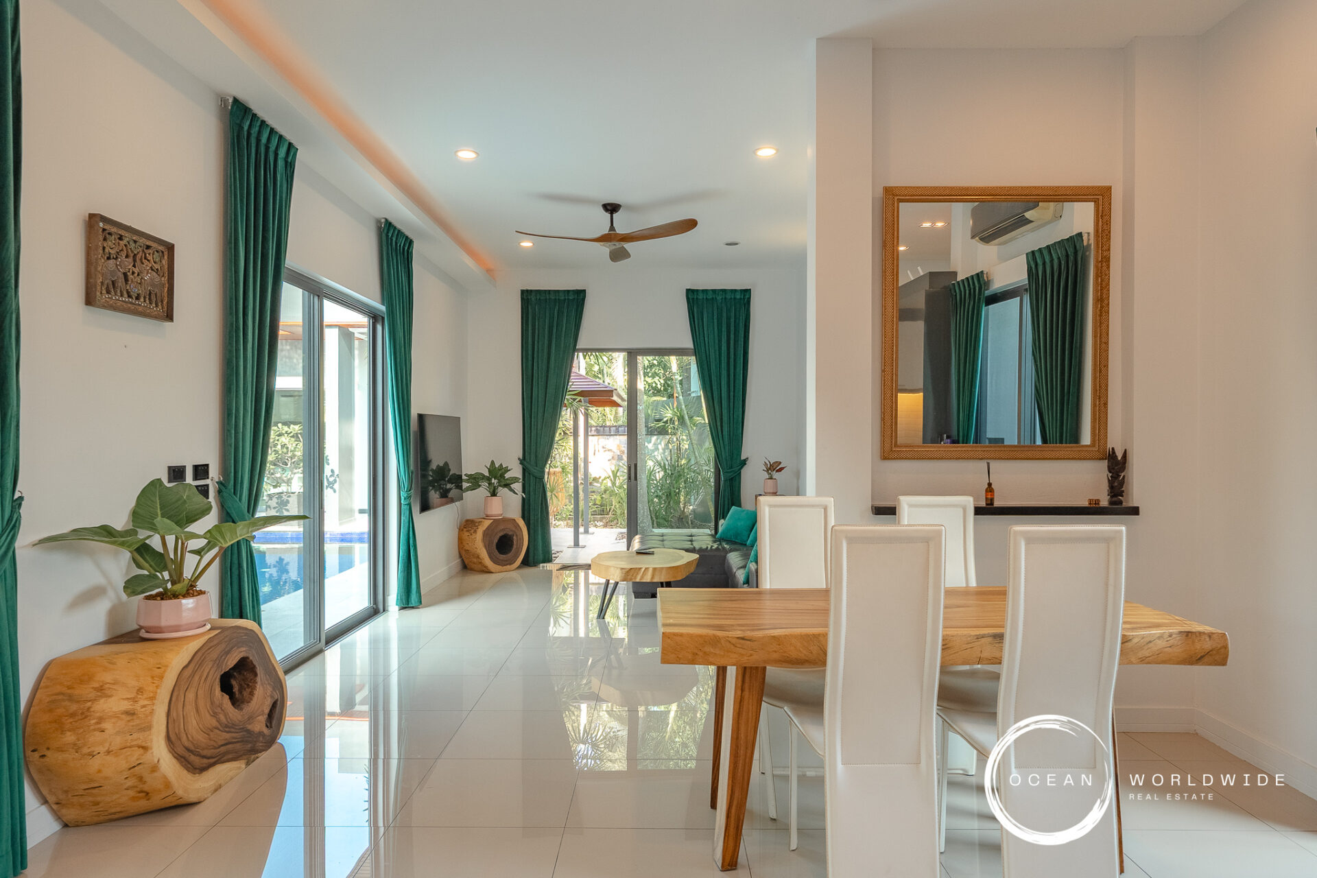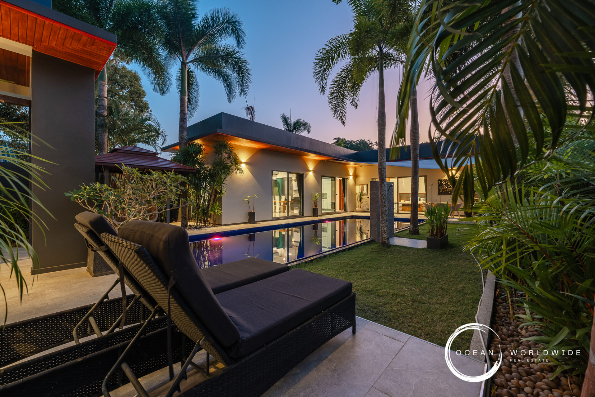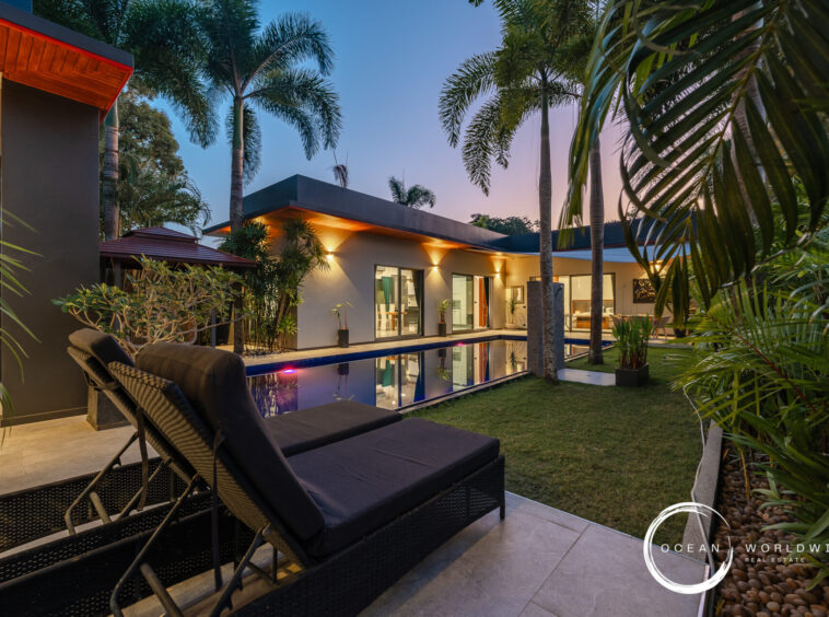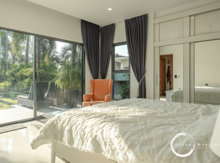 This villa boasts a thoughtfully designed interior that seamlessly integrates spaciousness with comfort. The layout is designed for effortless flow between living, dining, and sleeping areas, complemented by high-quality materials that exude sophistication. Its contemporary architecture is enhanced with traditional Thai elements, creating a welcoming atmosphere perfect for both relaxation and entertaining.