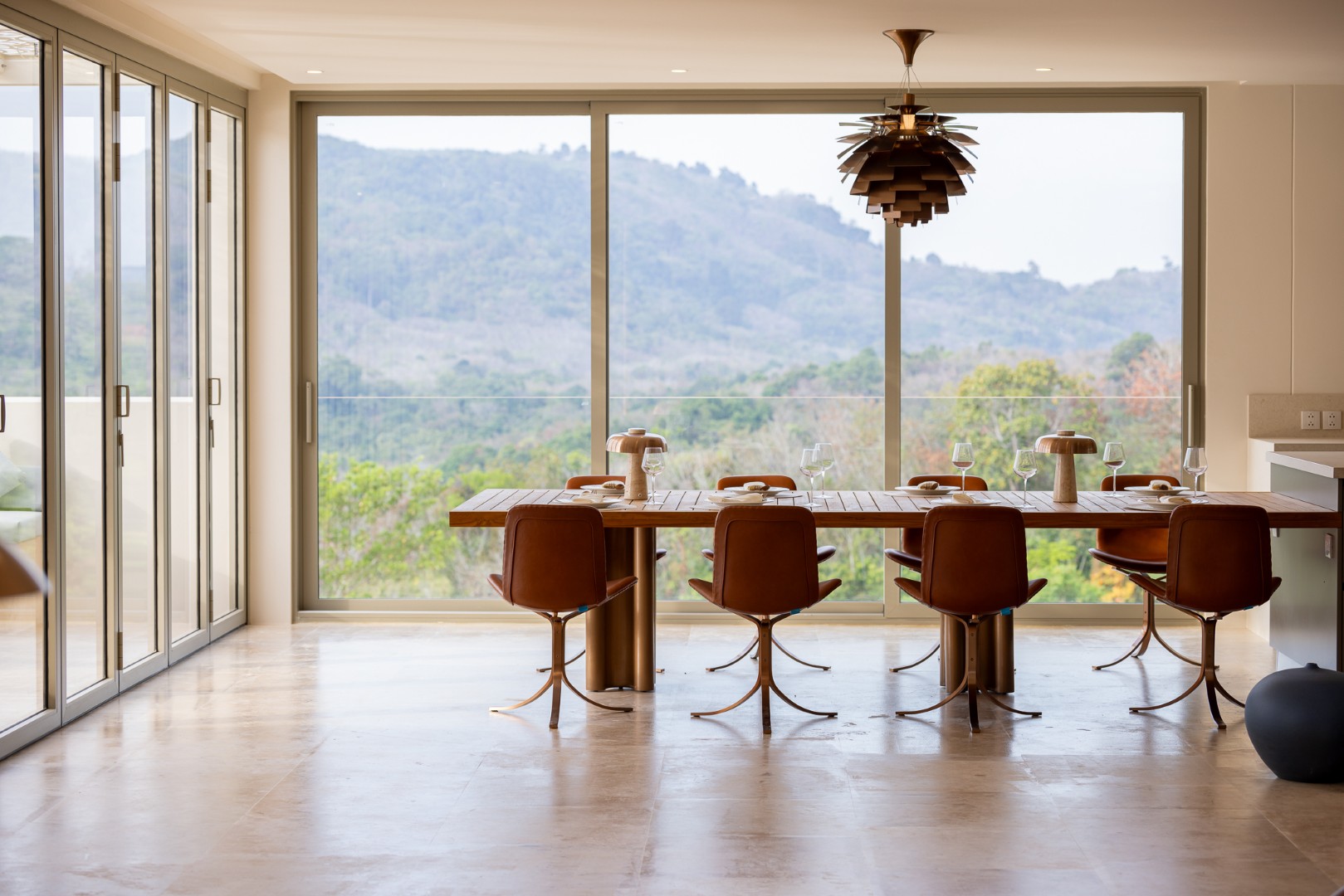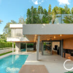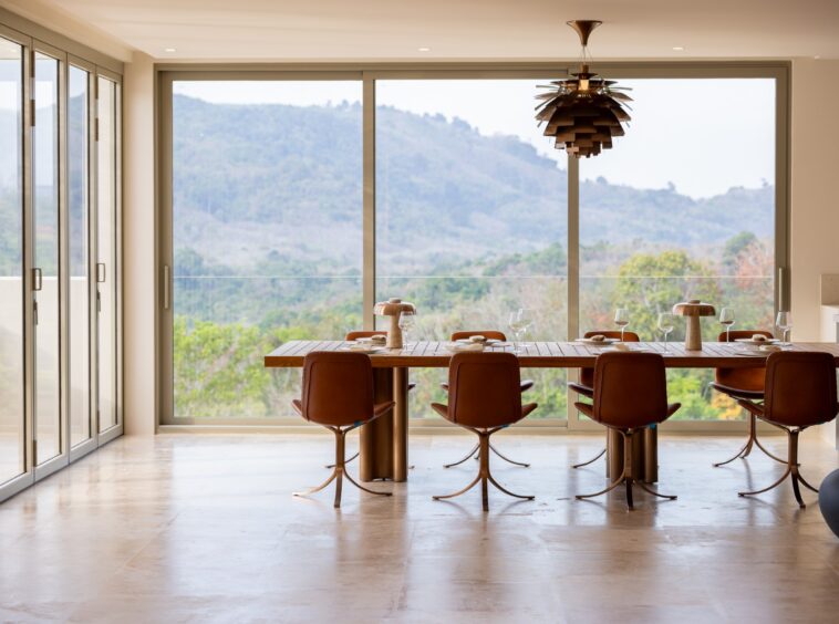 The villa’s interior optimally utilizes space with a harmonious flow between rooms. The architecture combines traditional Thai elements with contemporary design, showcasing high-end materials that reflect sophistication. The expansive vaulted ceilings in the main living areas create an open and airy atmosphere, while the fitted furniture compliments the elegant aesthetics.