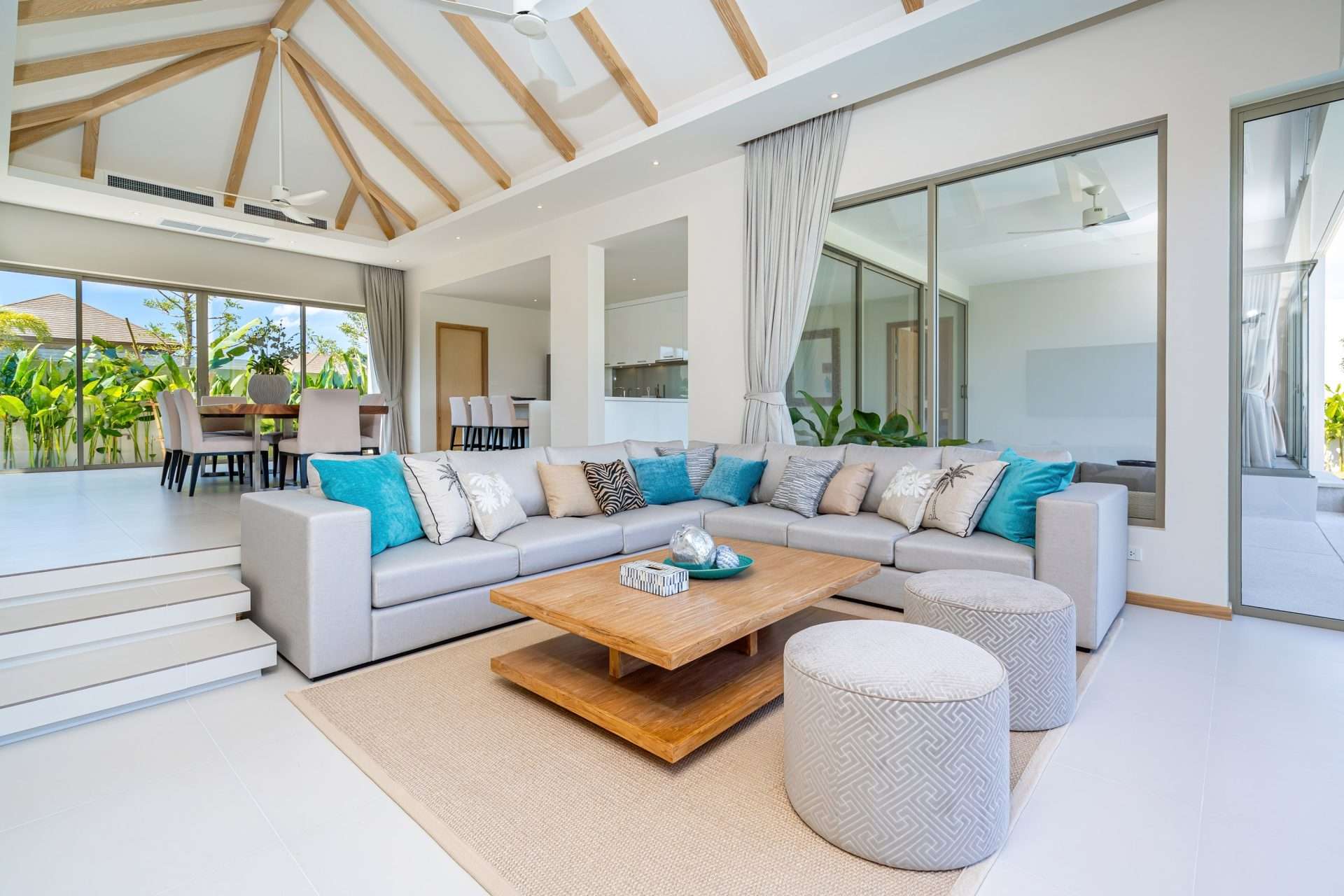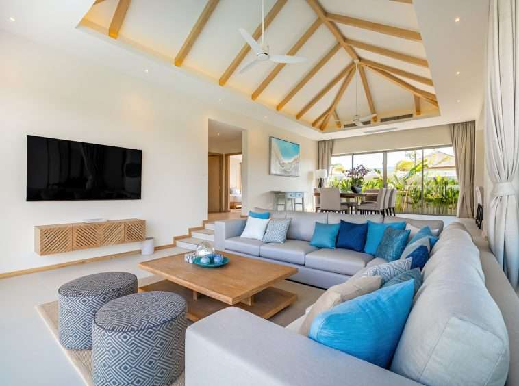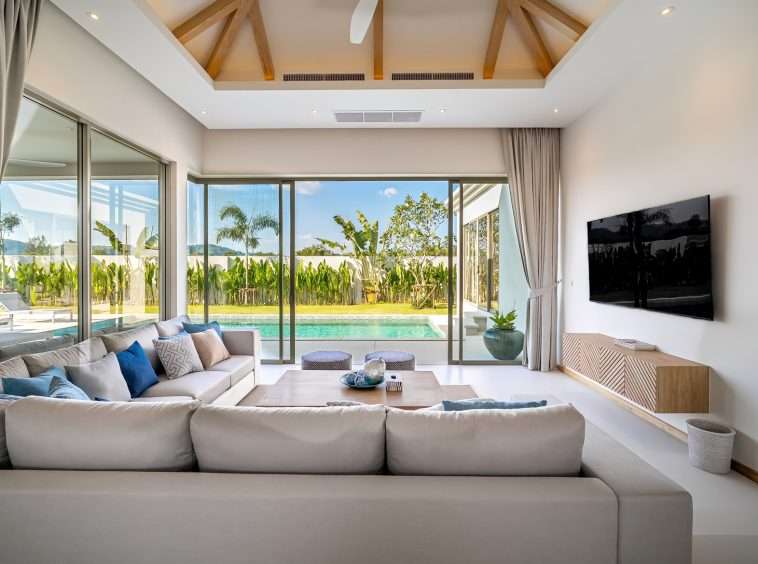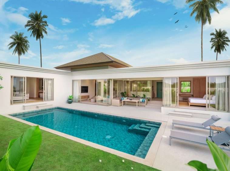 The outdoor space is a true highlight, featuring a stunning private pool surrounded by a landscaped garden. The villa’s design ensures privacy, with ample space for sunbathing and outdoor lounging. An outdoor sala enhances the living experience, offering a serene spot to relax and enjoy the tropical ambiance.