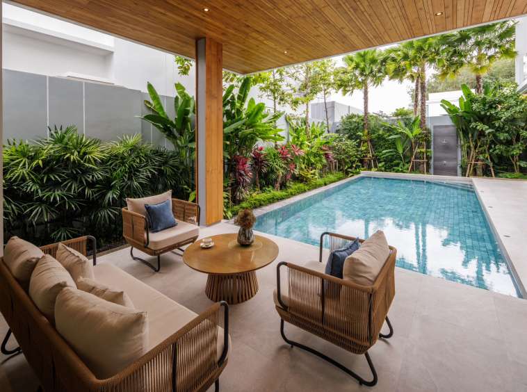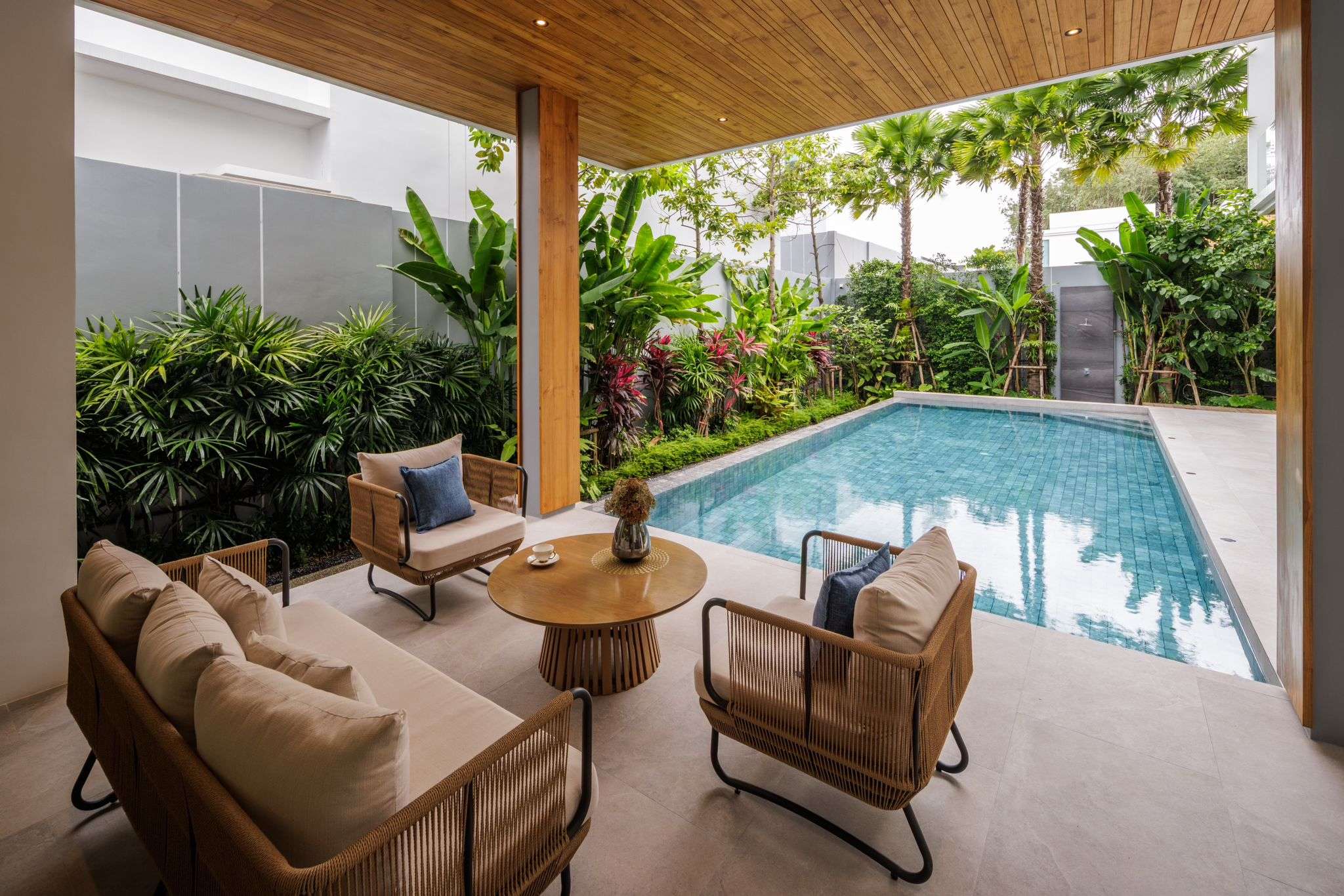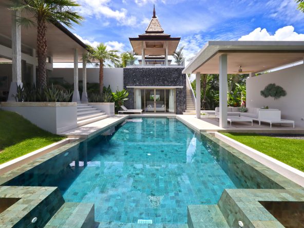The villa boasts beautifully landscaped gardens, providing a serene outdoor space for relaxation. A private swimming pool is central to the outdoor area, perfect for enjoying Phuket’s sunny weather. The design ensures privacy while promoting a sense of tranquillity.