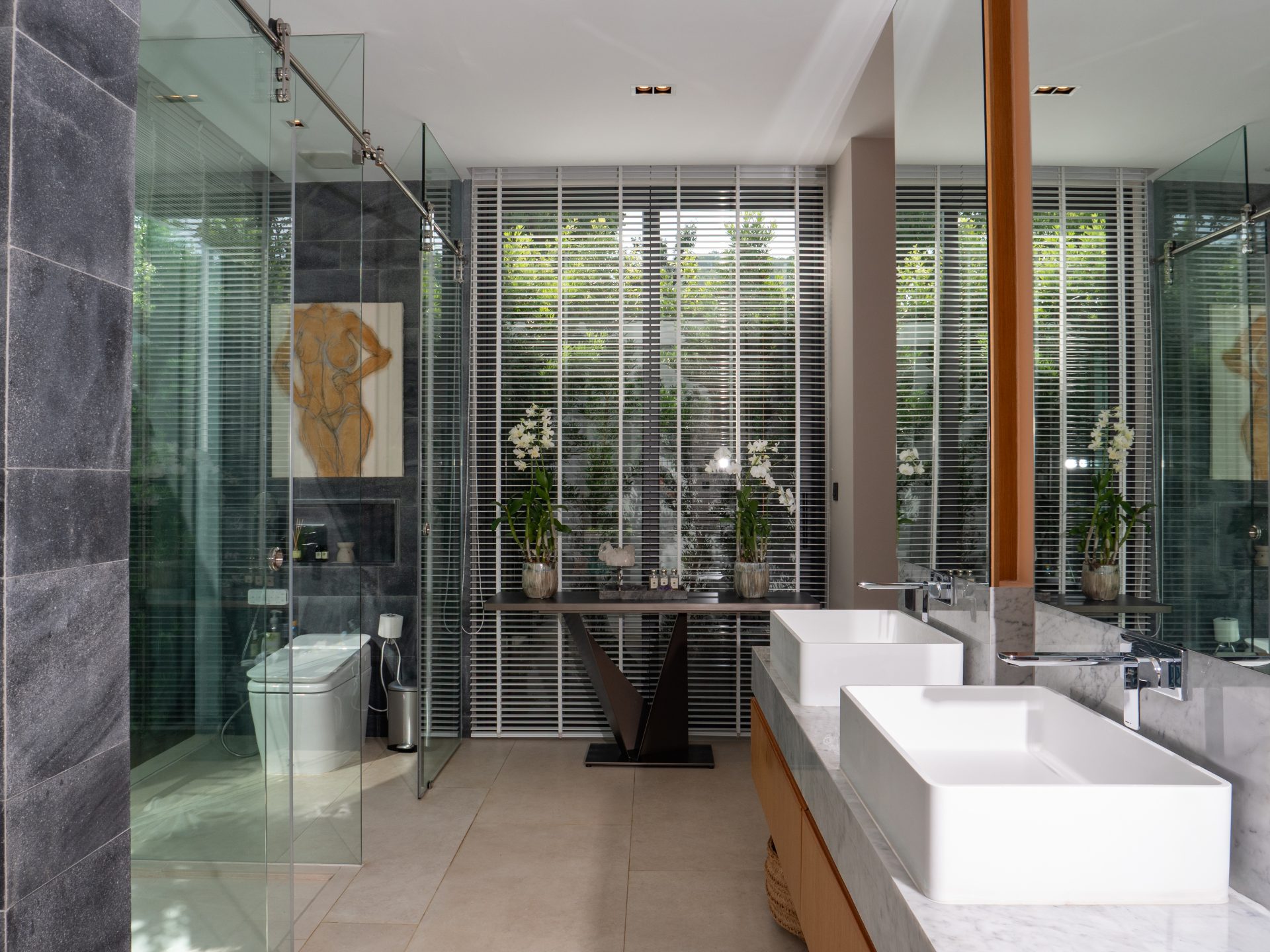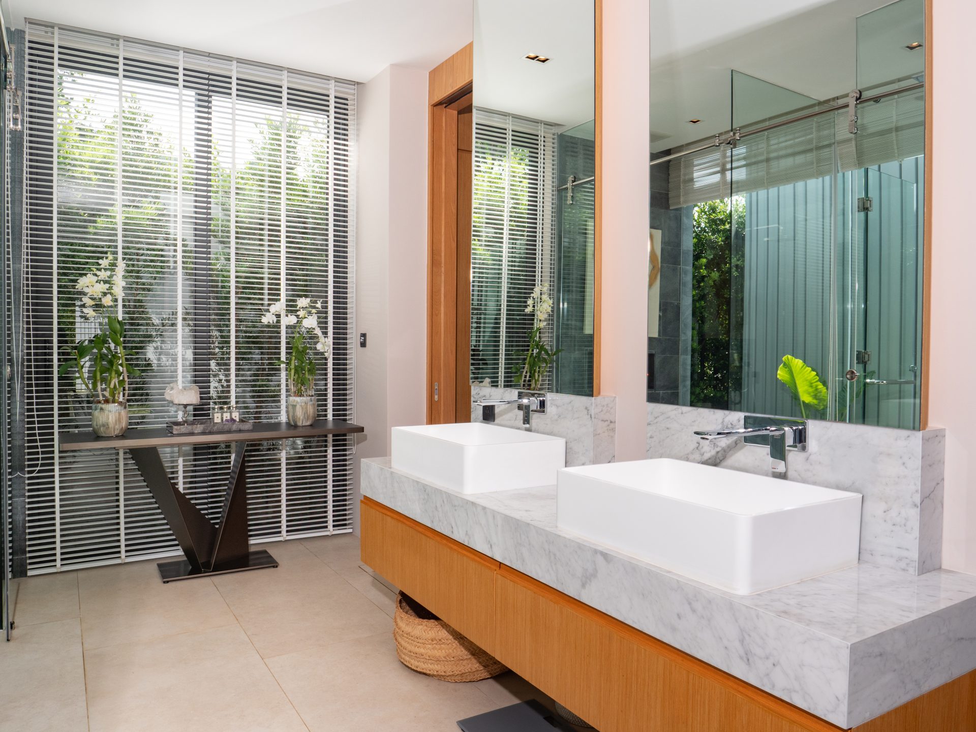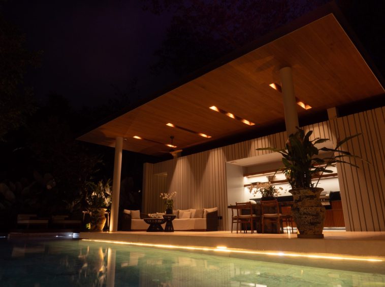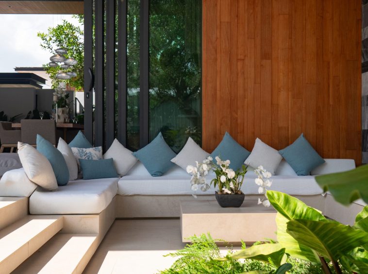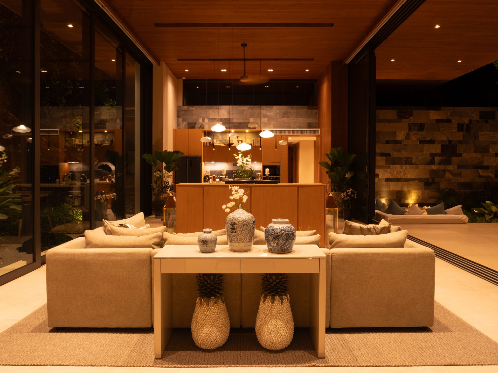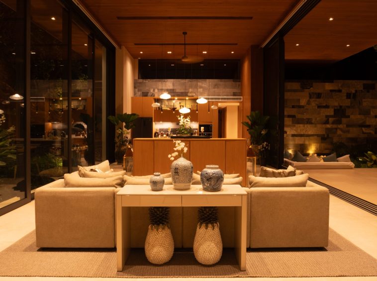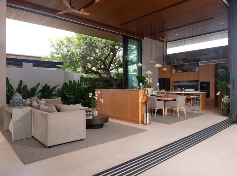 The home features six beautifully designed bathrooms and a bright open-concept living area with impressive 5.4-meter high ceilings. Floor-to-ceiling pocket doors open fully to the outdoor spaces, creating seamless indoor-outdoor living and allowing natural light to fill the villa throughout the day.