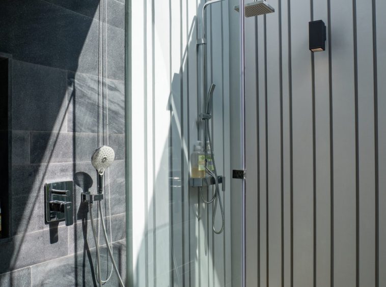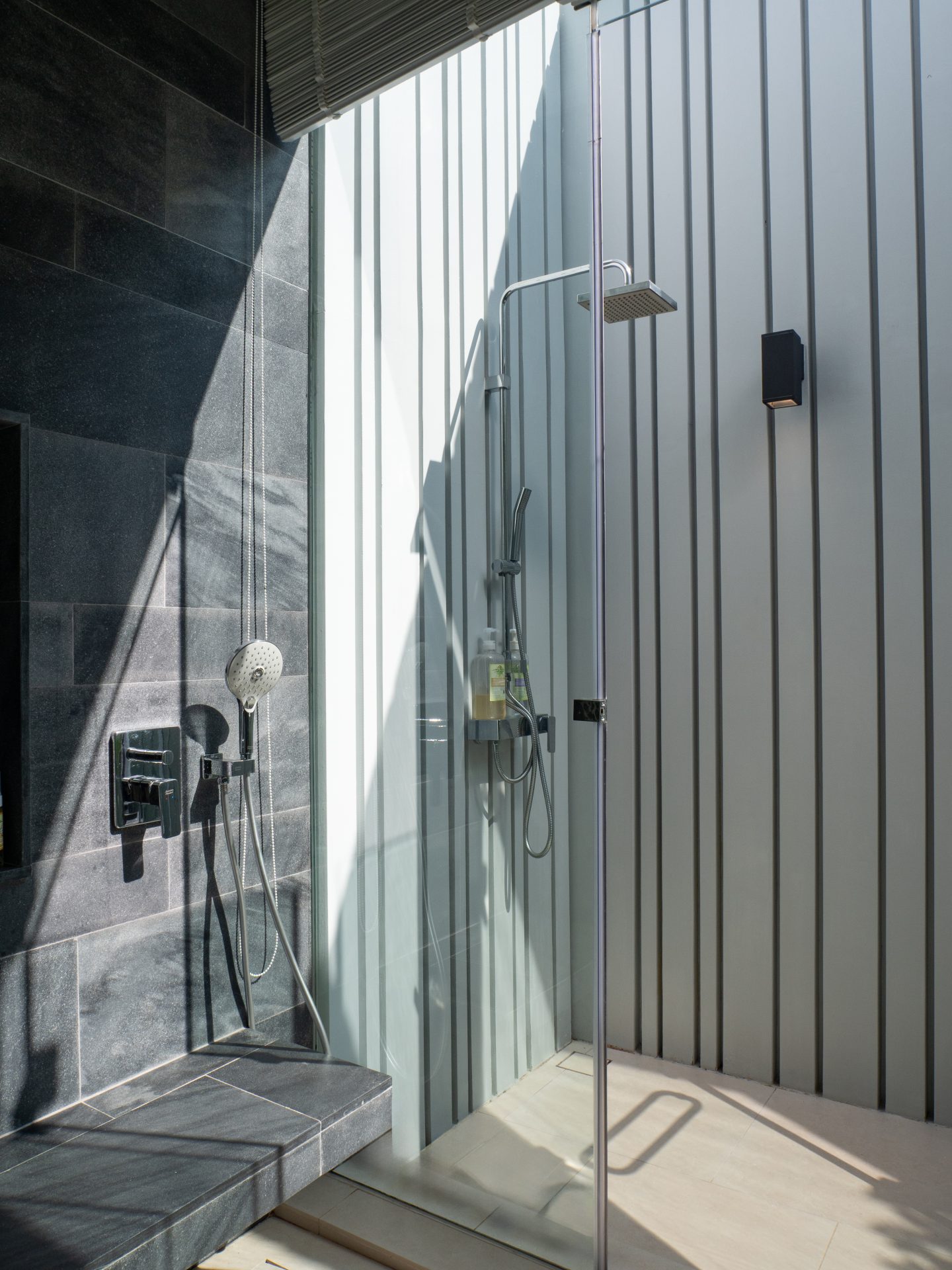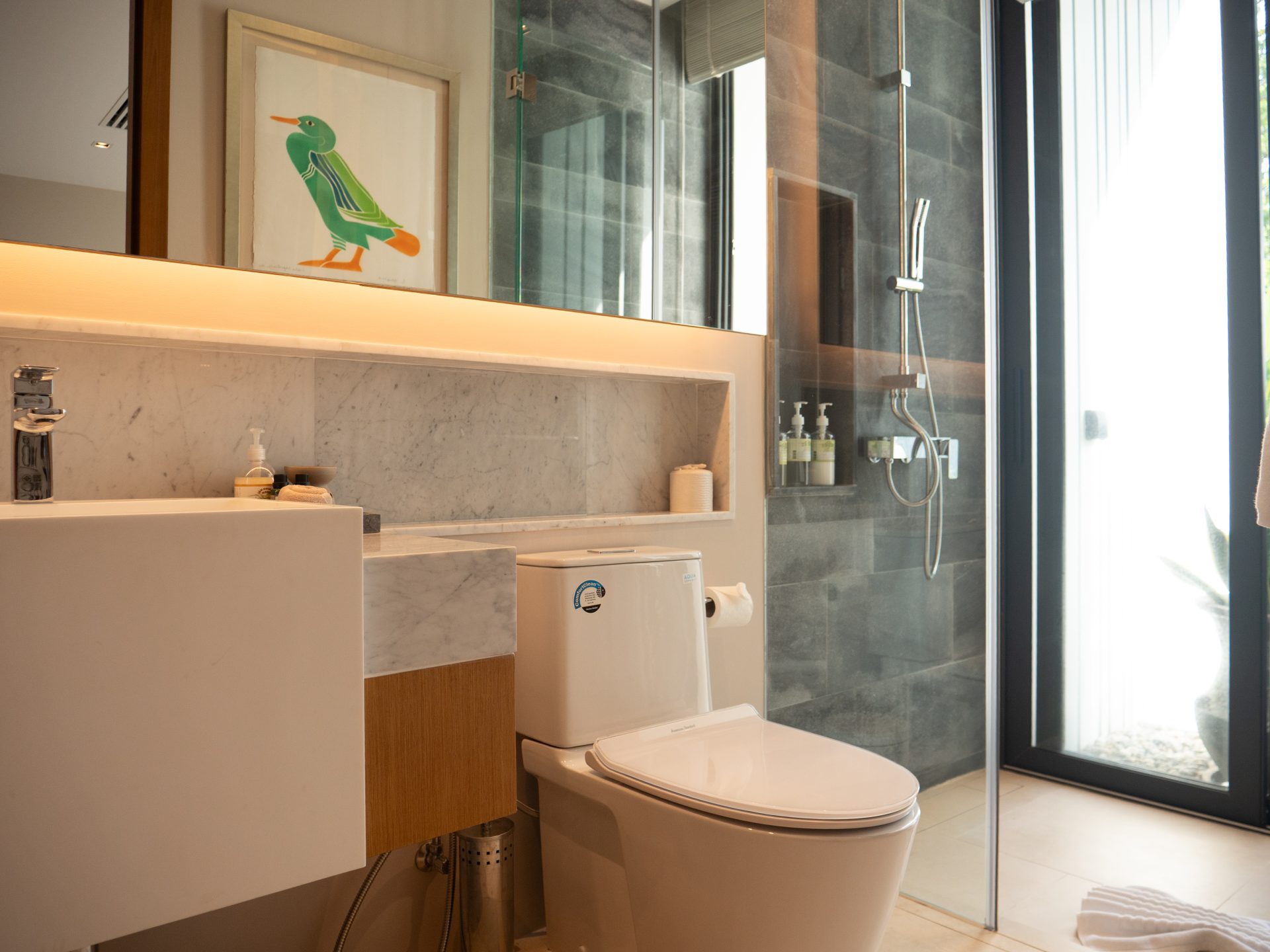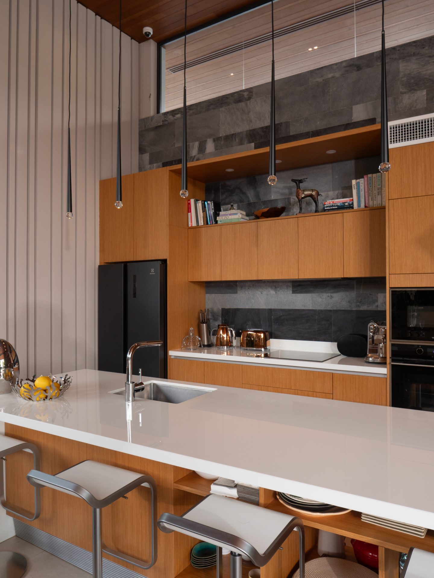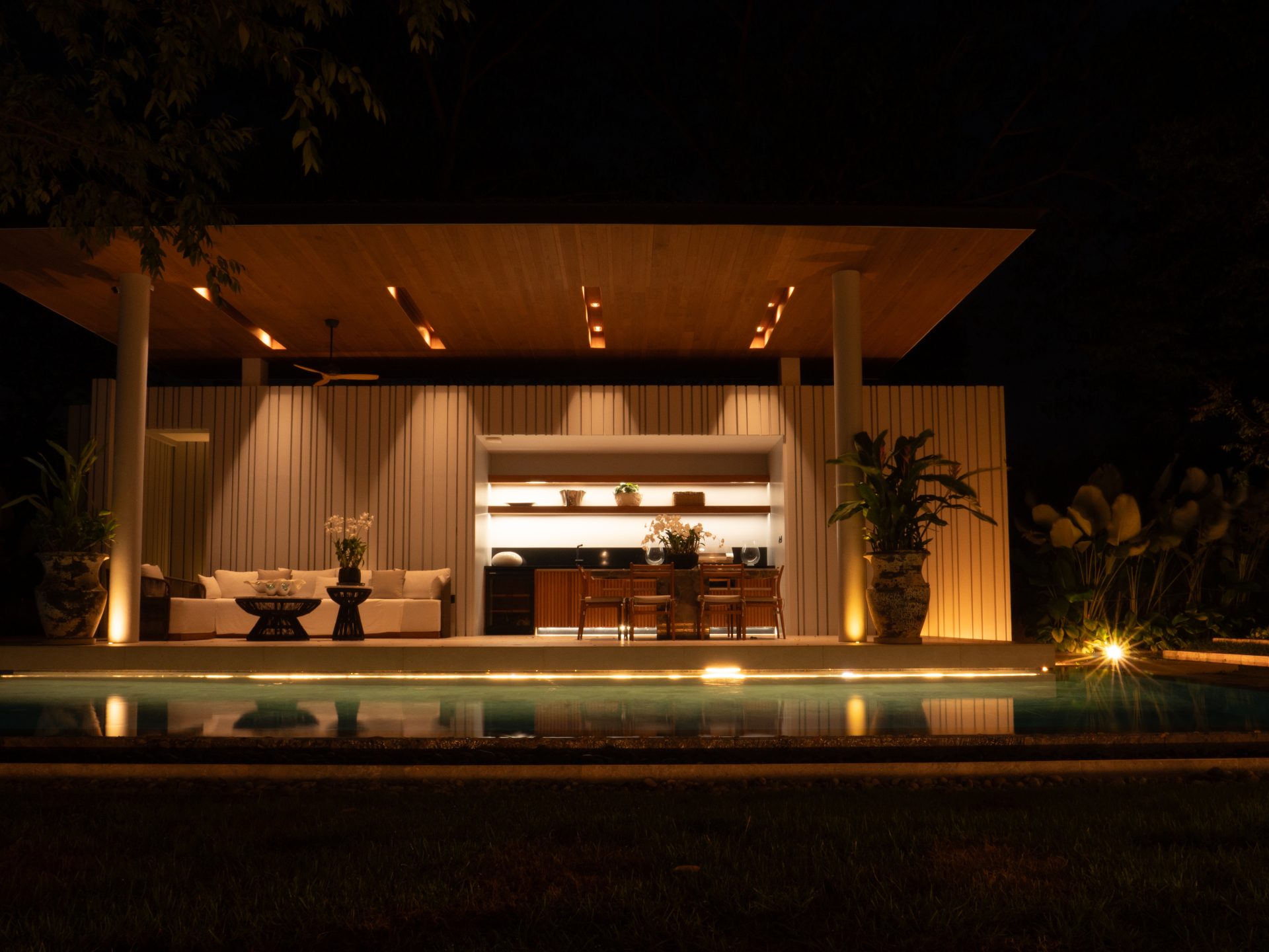 The home features six beautifully designed bathrooms and a bright open-concept living area with impressive 5.4-meter high ceilings. Floor-to-ceiling pocket doors open fully to the outdoor spaces, creating seamless indoor-outdoor living and allowing natural light to fill the villa throughout the day.