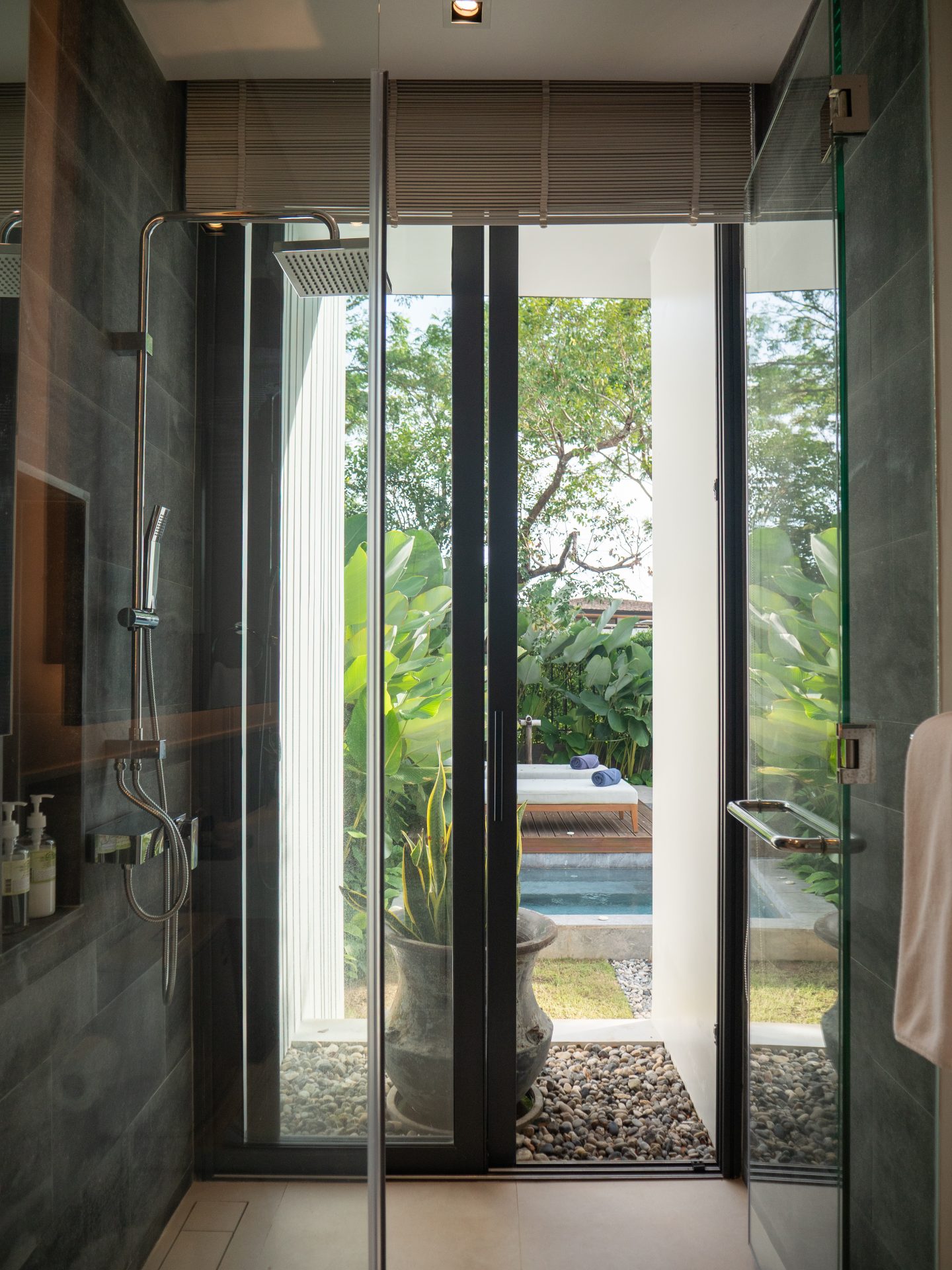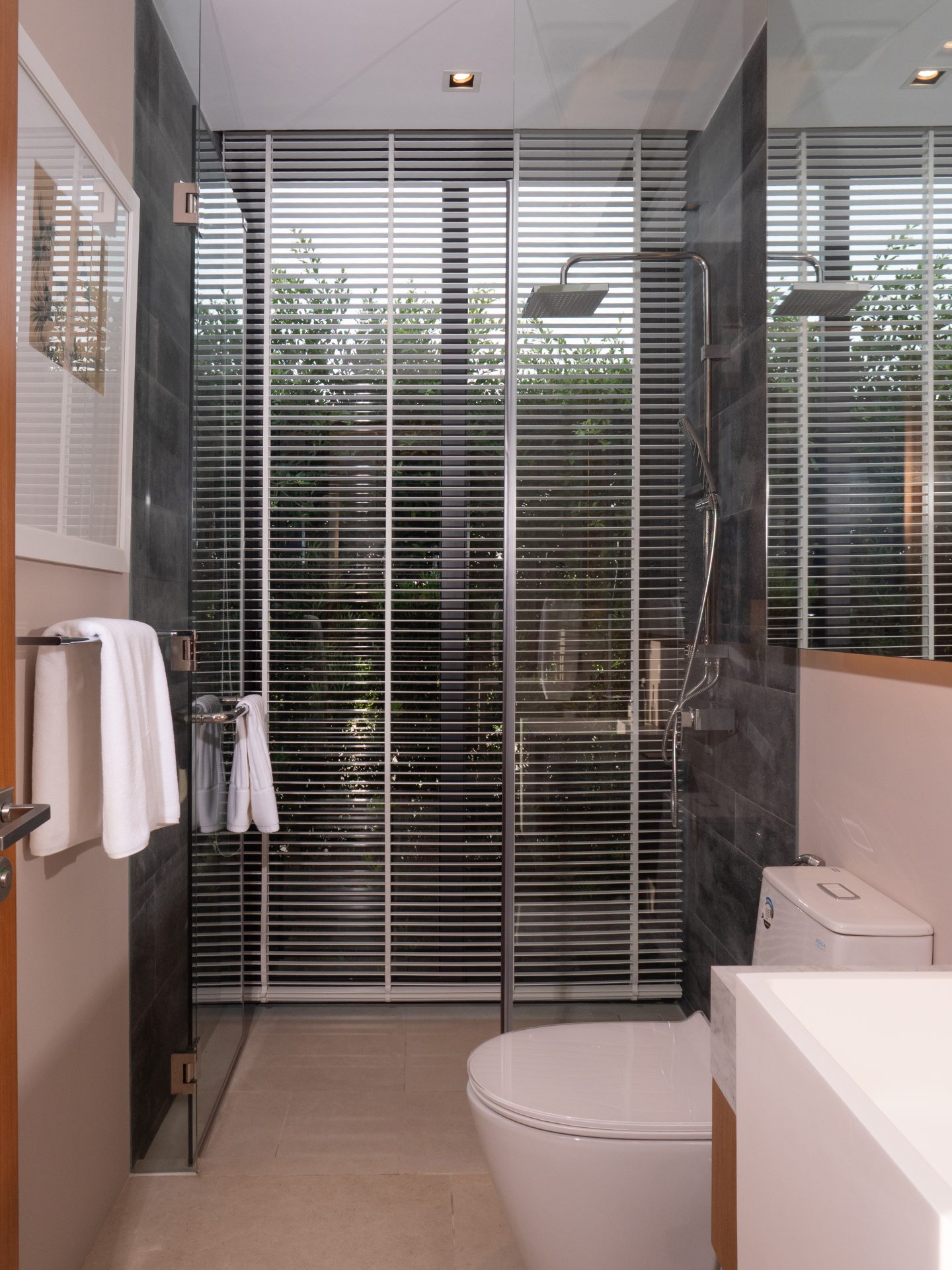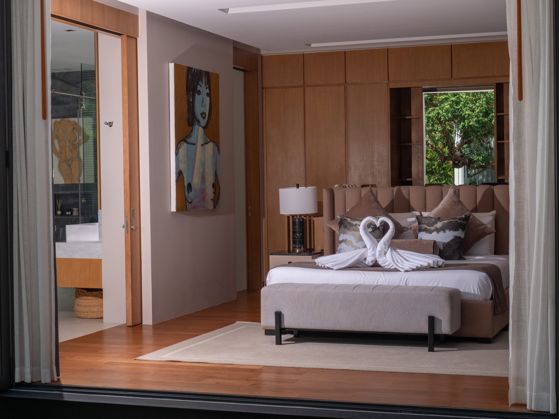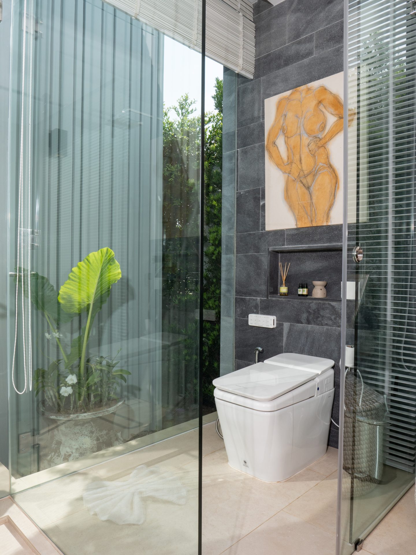 The primary bedroom suite offers exceptional privacy and comfort. It includes a private living area and a spa-like bathroom with a freestanding bathtub, outdoor shower, and Japanese toilet. The remaining bedrooms are well-sized and ideal for family members or guests.