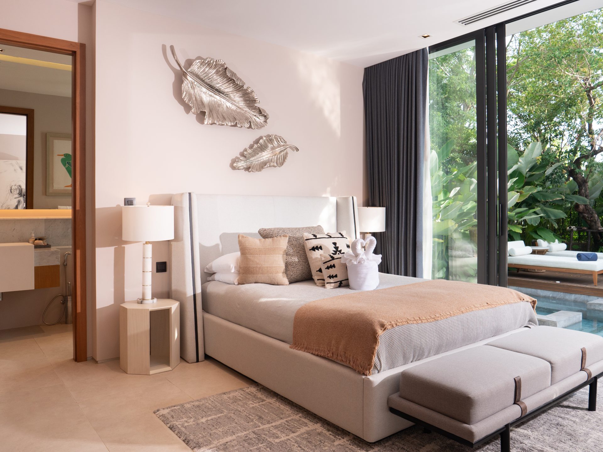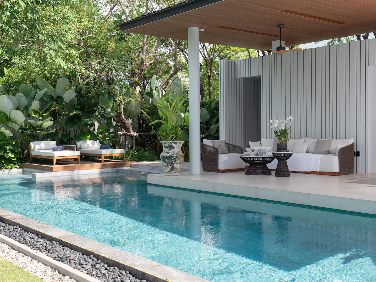 Throughout the villa, upgraded designer interiors and Balinese stone feature walls add warmth, texture, and a refined tropical feel.