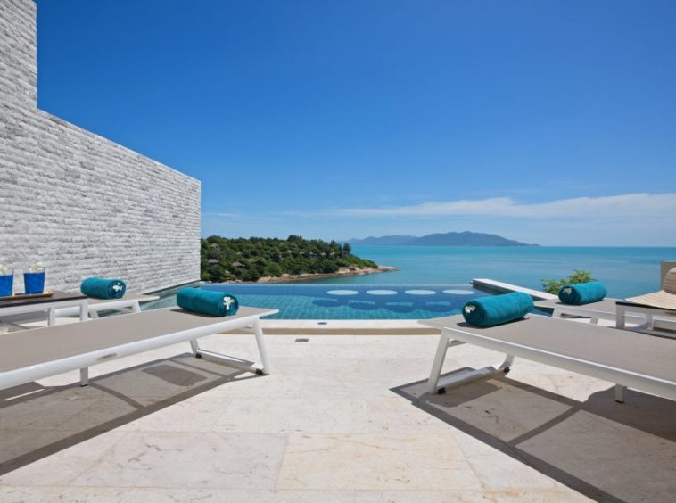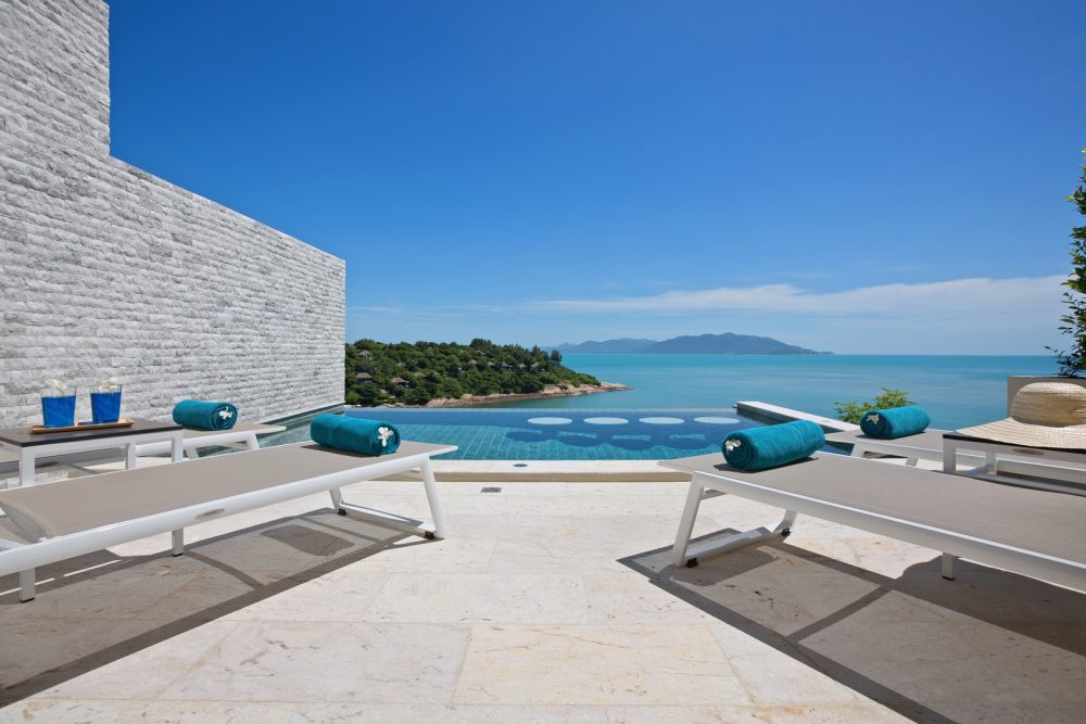 The villa’s terrace offers sunbathing, a coffee table, and a spacious bar with a small refrigerator and barbecue. The infinity pool with bali stones and bar stools directly in the pool allows guests to sip their cocktails while enjoying the view. A continental breakfast with fresh products from the island is served each morning, and daily housekeeping is provided. Guests can order European and Thai meals from a menu in the villa for their lunches and dinners, and they will be delivered to the villa within 20 minutes of ordering at competitive rates. It is also possible to organize a dinner with a Thai chef who will select the best products from the market.