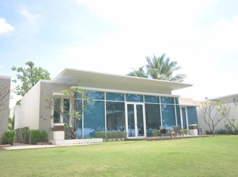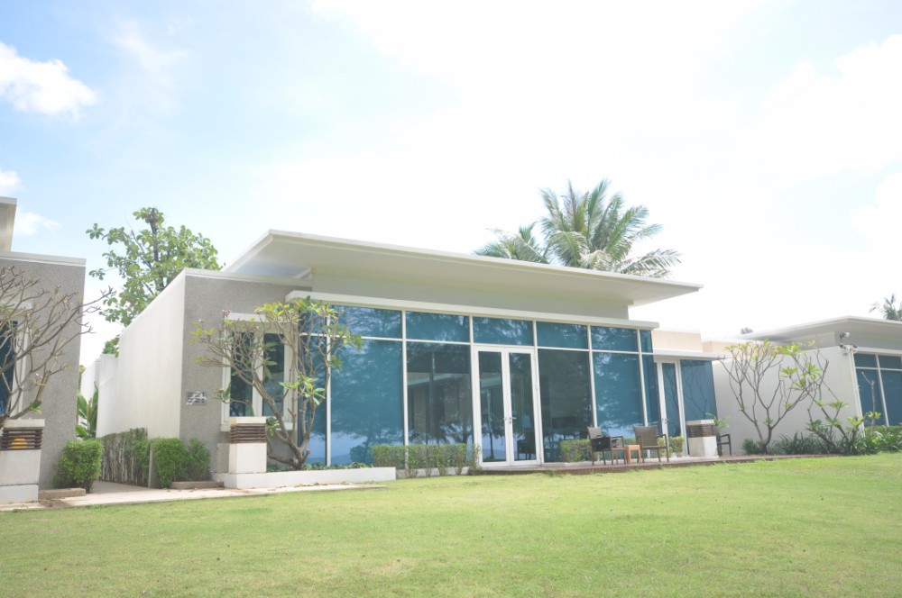 This is a single-storey, luxury, contemporary-styled beachfront resort pool villa. It was privately designed with a central pool in the internal walled courtyard, with bedrooms along the outer edges, and a living room, dining area, and kitchen along the sea-facing side. The master bedroom has a direct beach and sea-facing view and comes with a spa-type bathroom area, with a separate walk-through wardrobe, twin vanity sinks, a large Jacuzzi-style bath, and a separate shower room. The second and third bedrooms also have their own en-suite bathrooms, with the second also featuring a private bathtub.