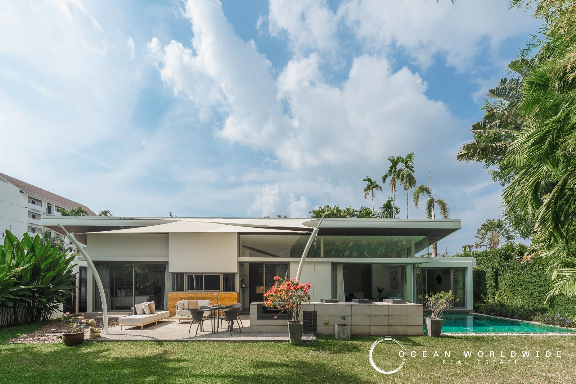 The open-plan living space offers a picturesque view of the surrounding pool, a generous patio, and the lush garden. This area boasts floor-to-ceiling windows that can be fully retracted into the wall, equipped with sliding mosquito screens. The roomy bedrooms come with expansive wall-to-wall wardrobes for ample storage.