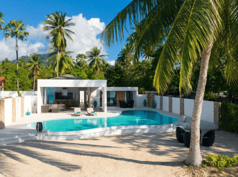 Explore a beachfront villa in the south of Koh Samui with 3 ensuite bedrooms. Modern design, breathtaking sunset views, and a round-shaped swimming pool. Fully furnished, easy access to amenities. Leasehold property with a starting price of 25,900,000 THB.