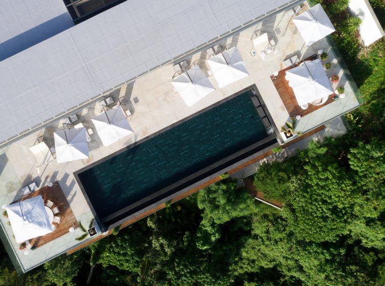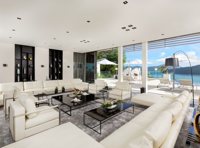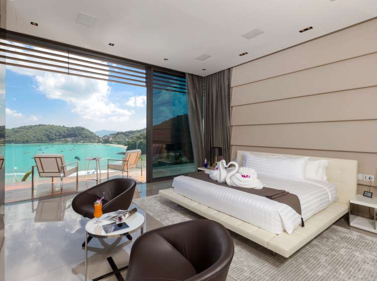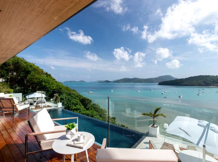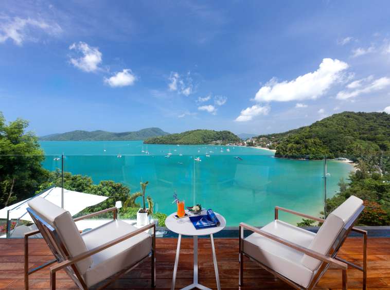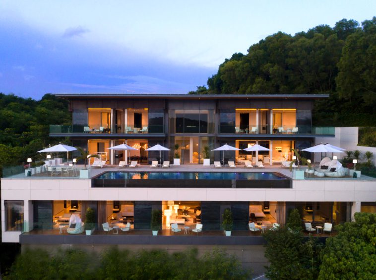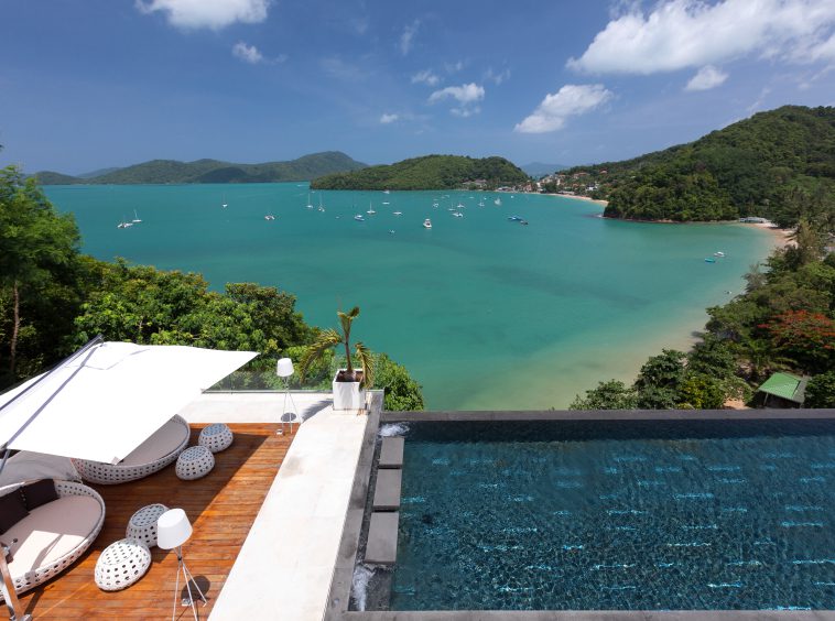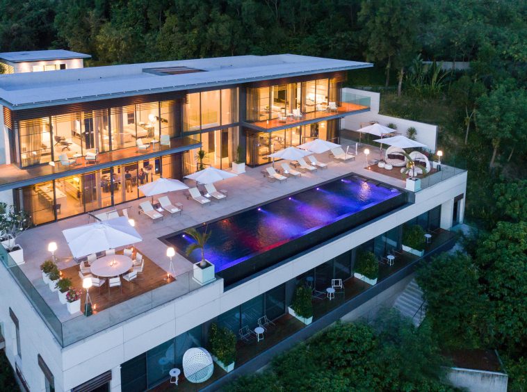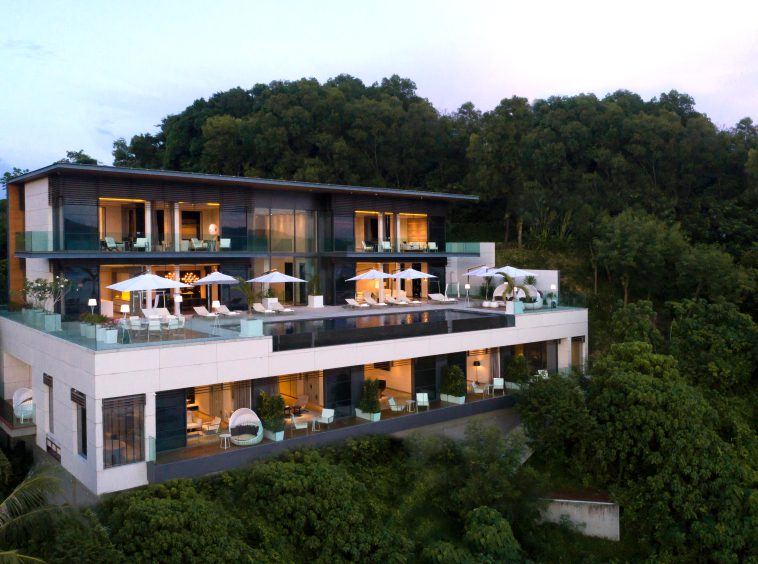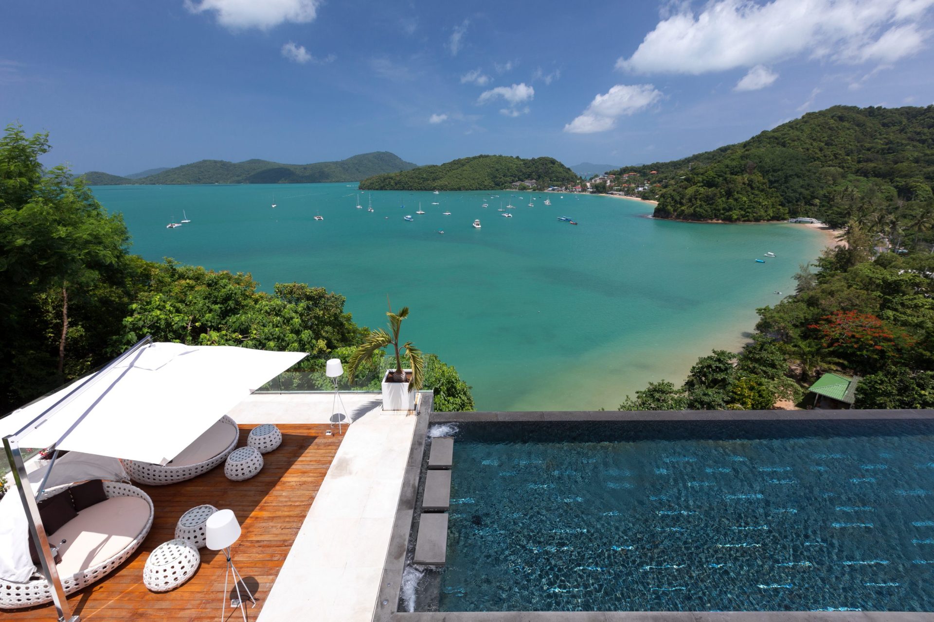 Cliff Top Residence is a stunning ultra-modern villa perched upon a cliff with amazing panoramic views of Ao Yon Bay on the east coast of Phuket. The villa features six luxurious suites, spacious living areas, two fully-equipped kitchens, an infinity-edge swimming pool, expansive sun decks, Jacuzzis, private fitness gym and a triple space Atrium.