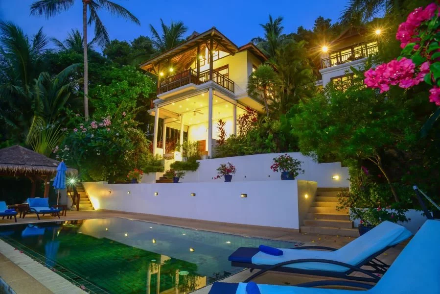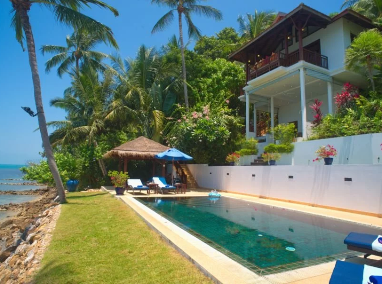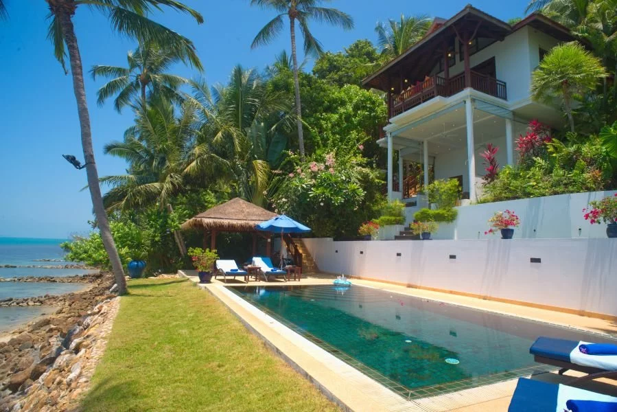 Mae Nam beachfront villa for sale, 4 bedrooms, luxury resort, private pool, ocean views, tropical landscaping, resort facilities, full-service rental investment, property for sale.
