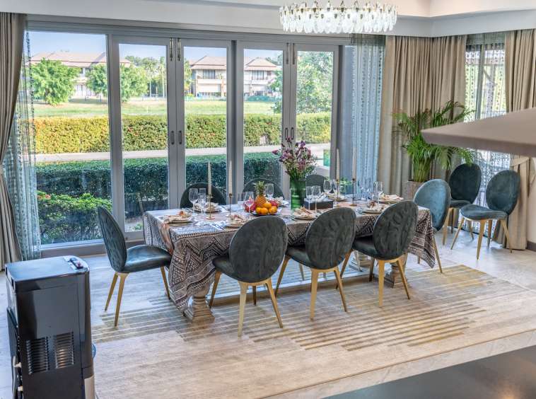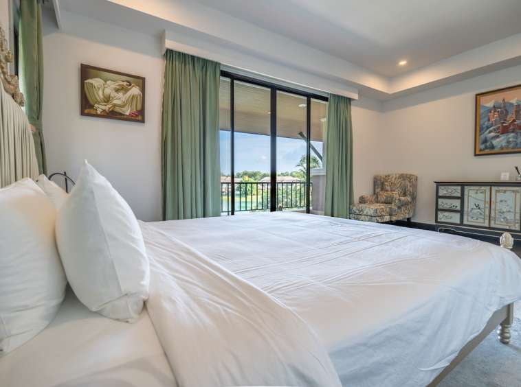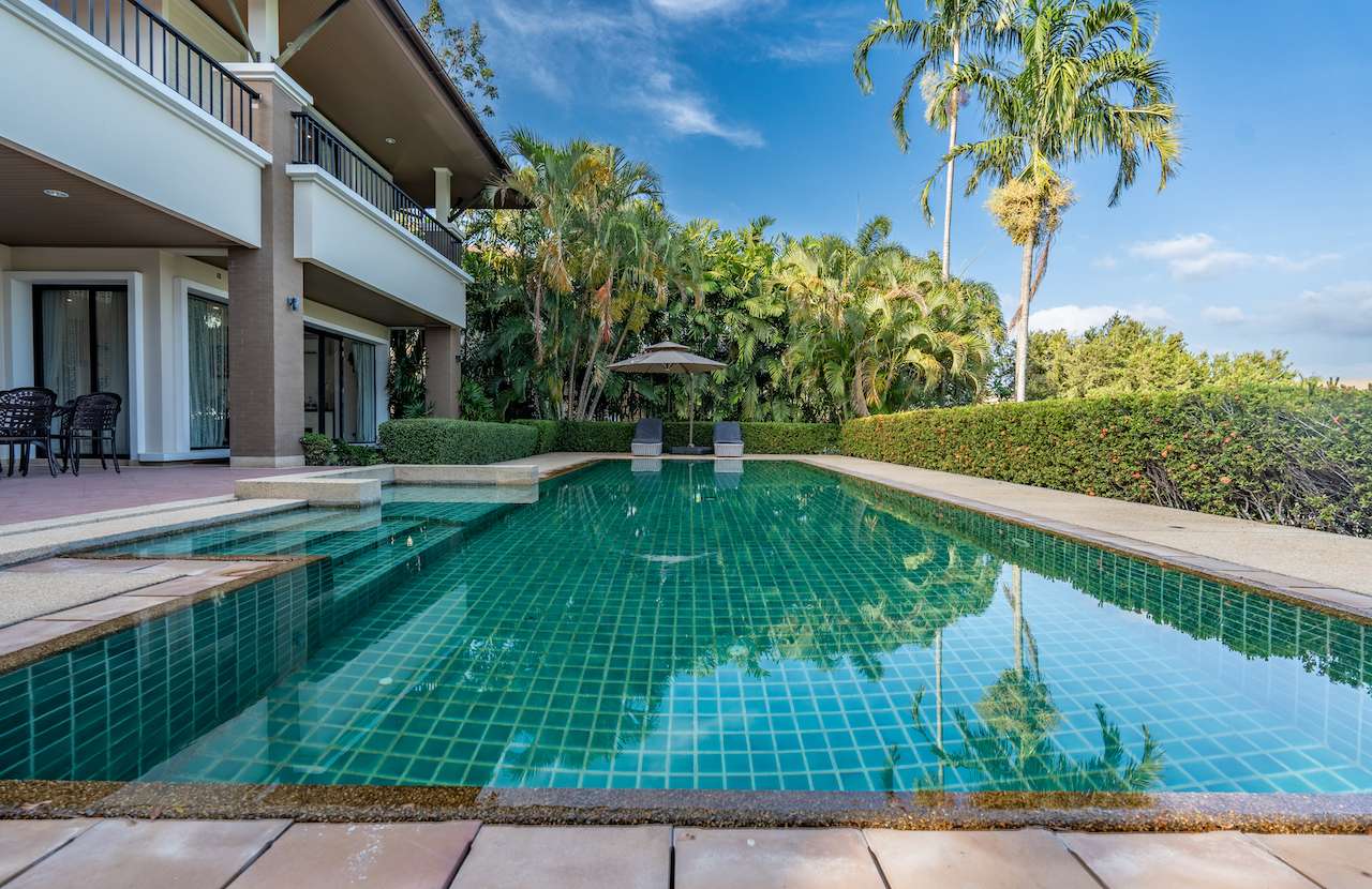 Embracing the tropical lifestyle, the outdoor spaces are equally impressive. The private pool is surrounded by a beautifully landscaped garden, providing an ideal space for family leisure or intimate gatherings. The serene views of the golf course and verdant surroundings offer a picturesque backdrop that enriches outdoor living experiences.