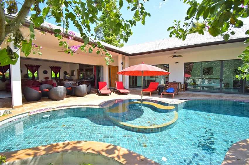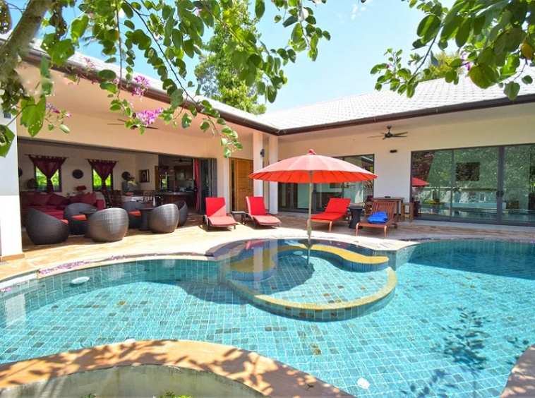 Bang Por beachfront villa, 4-bedroom pool villa, secure residence, private swimming pool, tropical living, freehold ownership, Chanote title deed, convenient location, fully furnished, serene beach living.