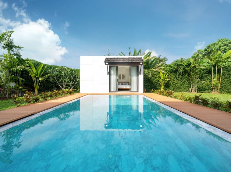 The outdoor area includes a private swimming pool (2.45 x 6.4 meters) surrounded by a landscaped garden, providing a relaxing space for leisure and entertainment. Shared parking is available within the community.