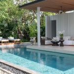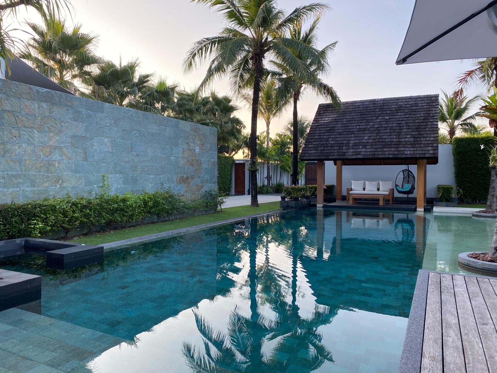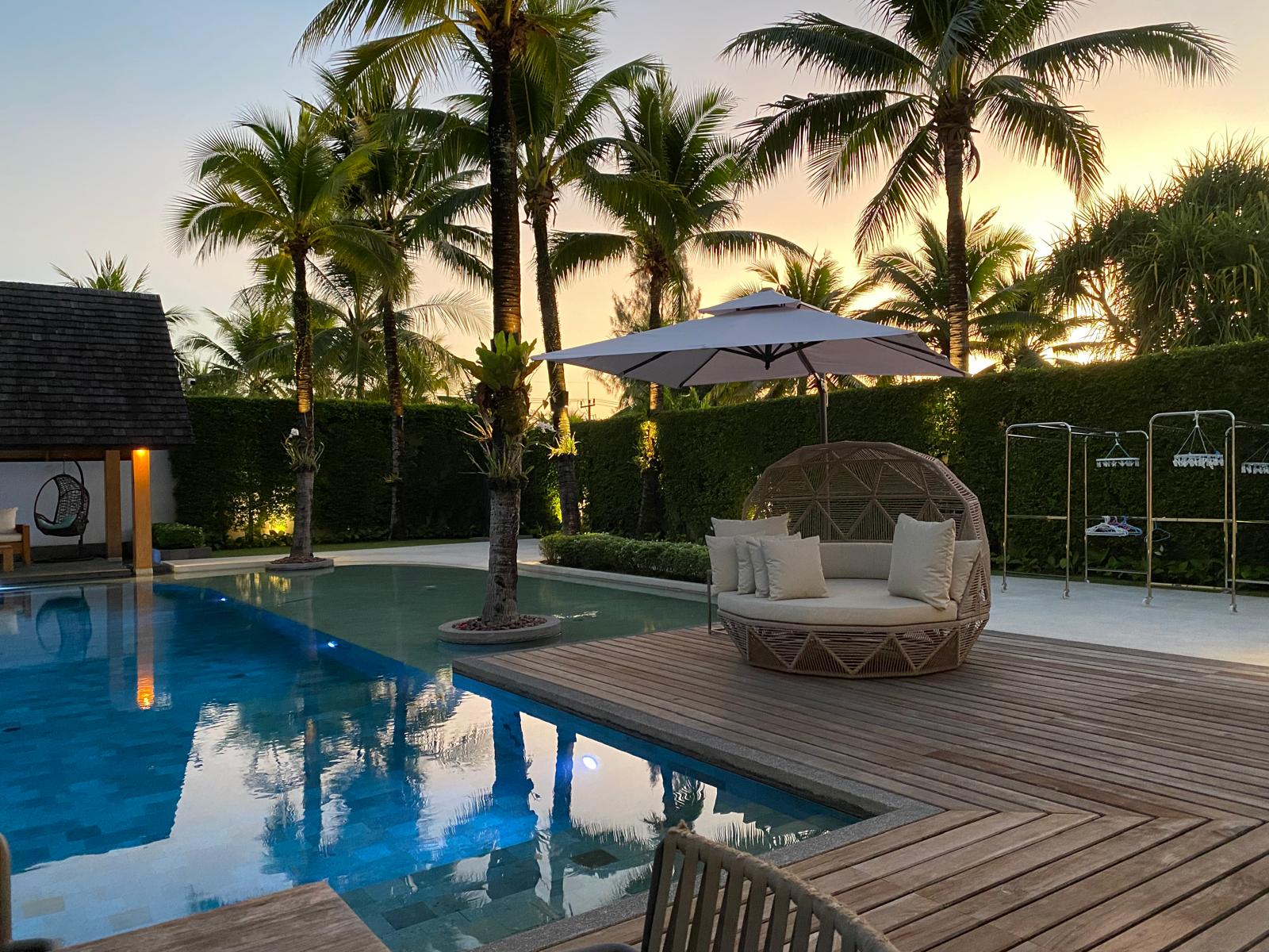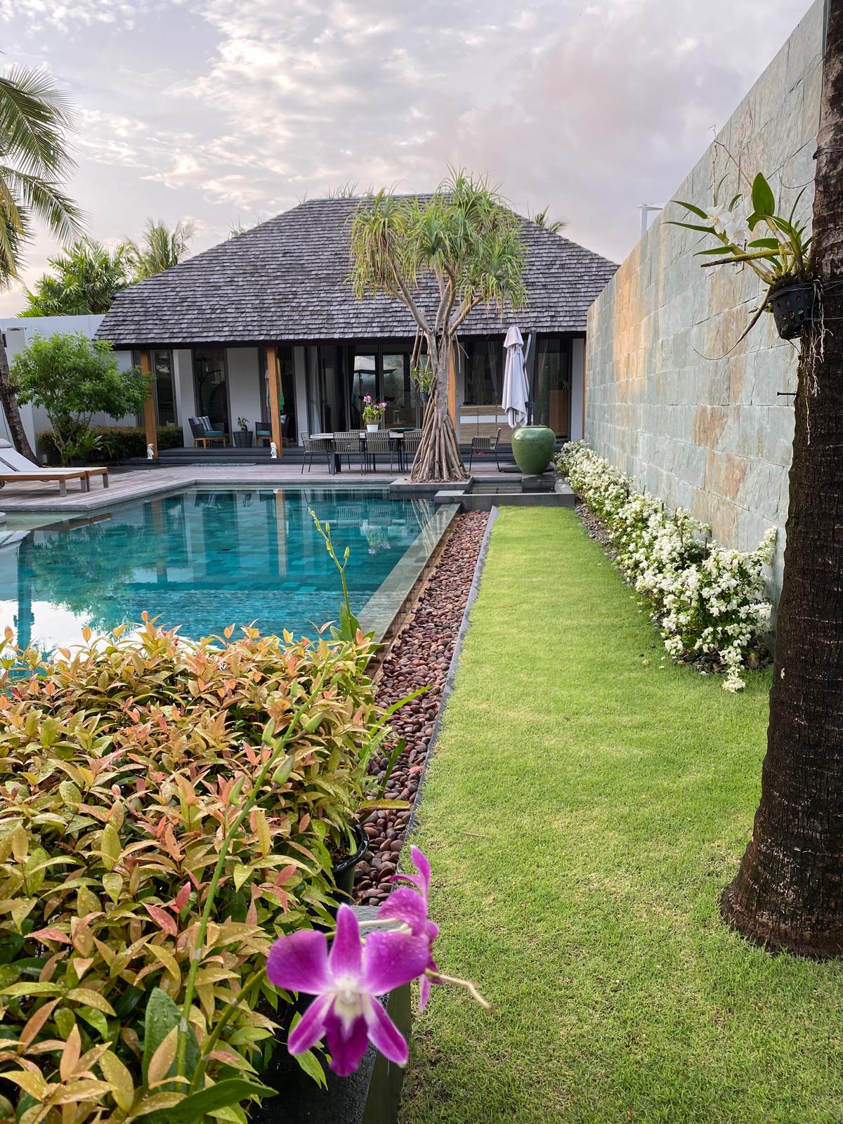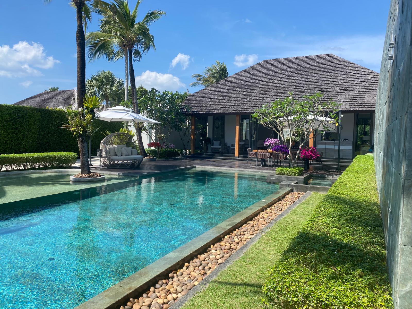 The outdoor area is a private sanctuary, with lush gardens surrounding the property. The 18-meter pool serves as the centrepiece, offering a serene spot for sunbathing and family gatherings. Enjoy the tranquillity and privacy afforded by the extensive grounds, ideal for hosting friends or simply unwinding in the tropical climate.