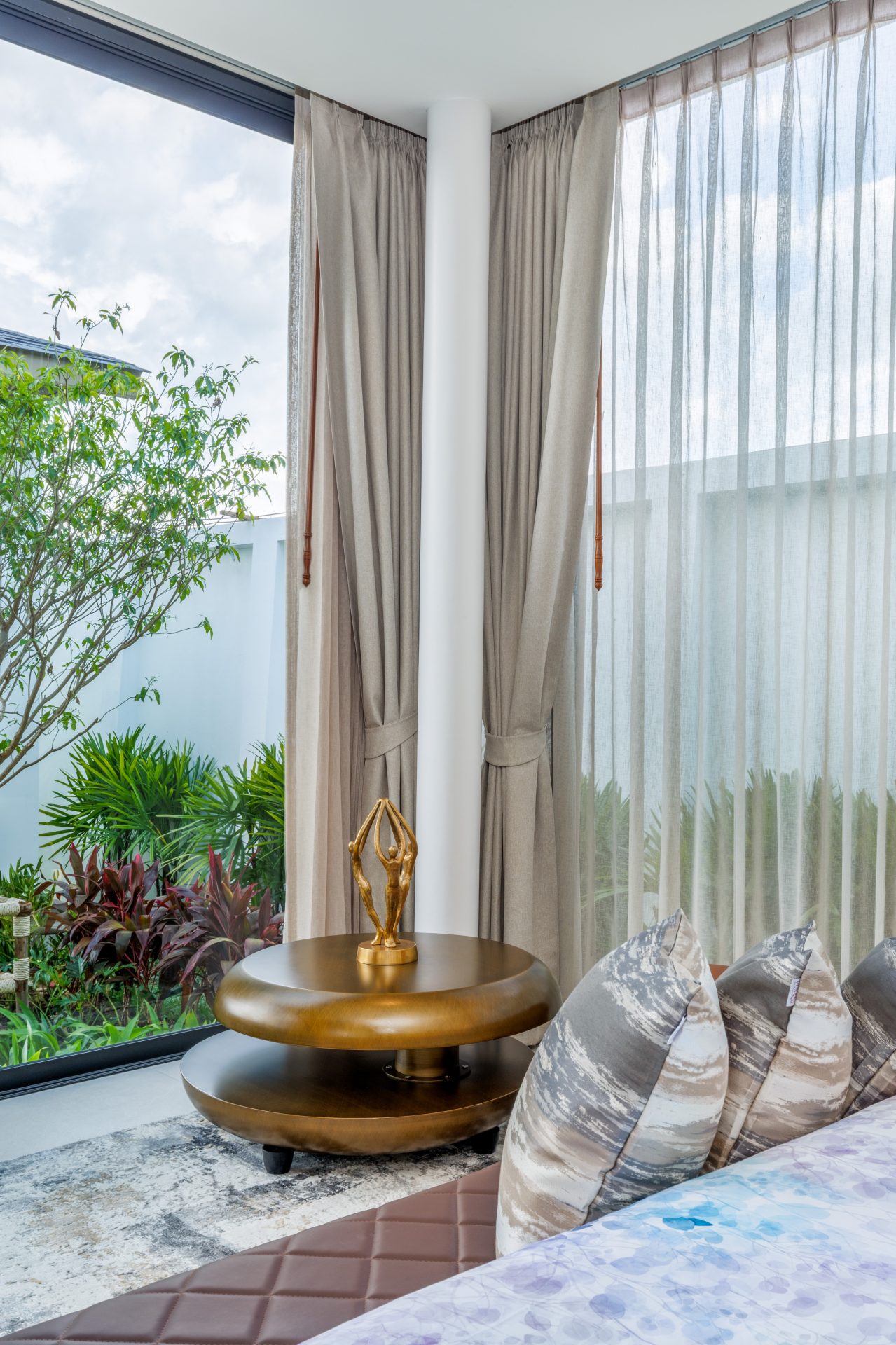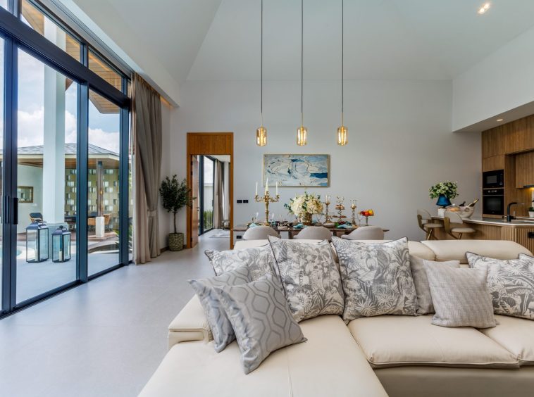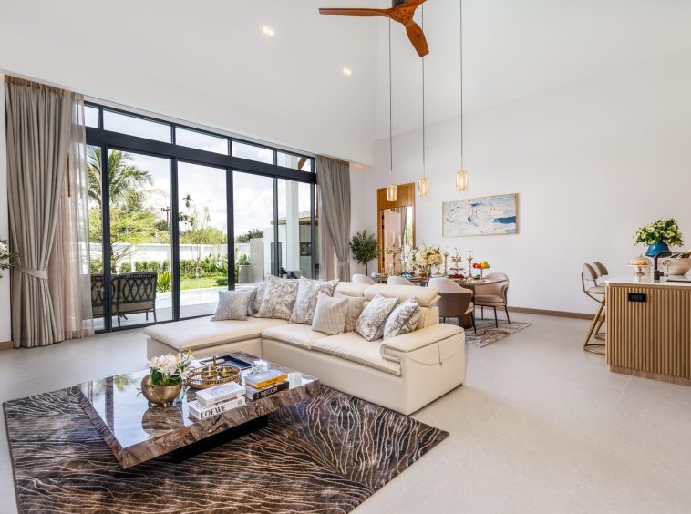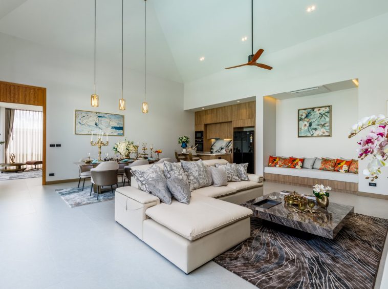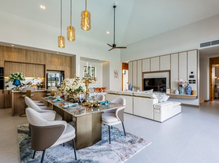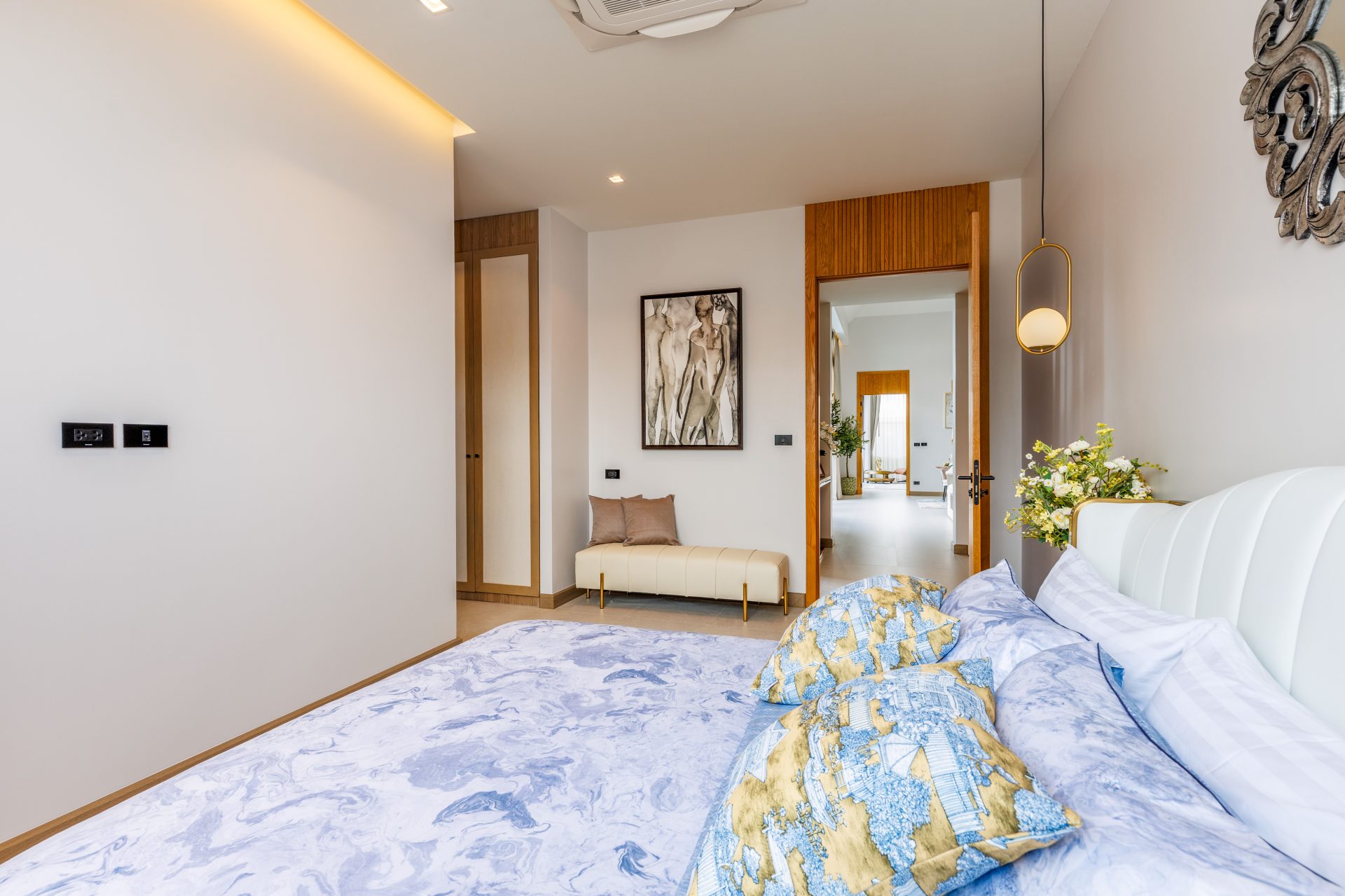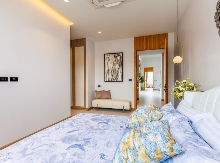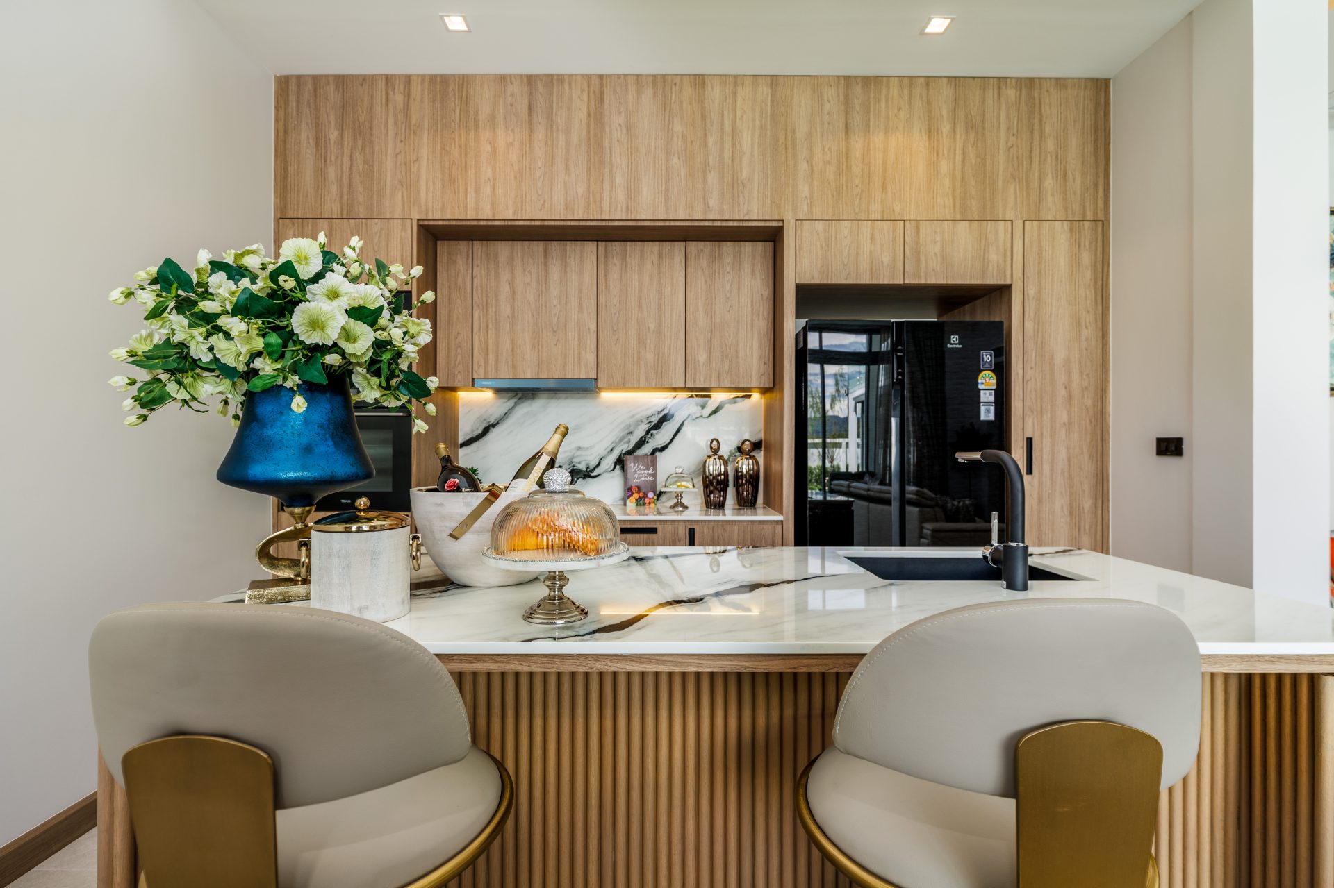 The villa’s design artfully incorporates iconic gabled roofs, reflecting the architectural heritage of Thailand’s Ayutthaya era. The interior flows effortlessly, allowing natural light to illuminate the open-plan living spaces. High-quality materials enhance the overall atmosphere, promoting a sense of calm and tranquillity within.