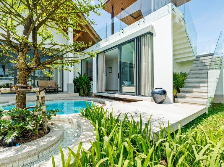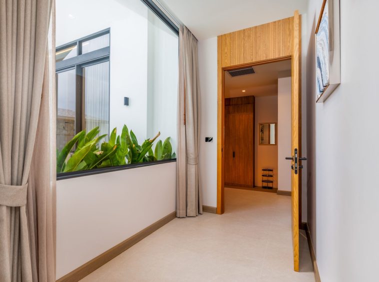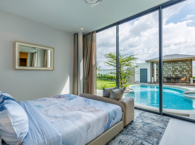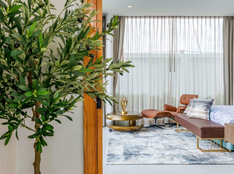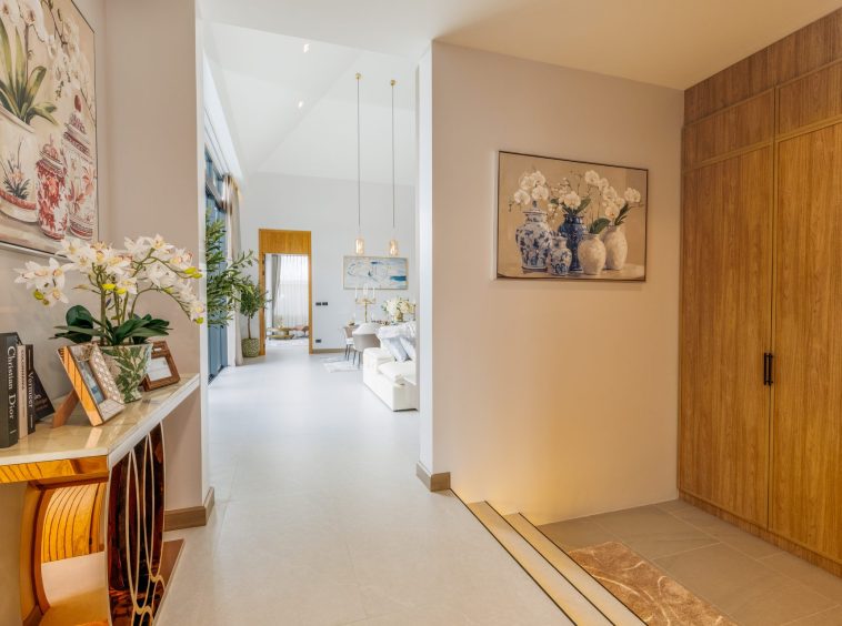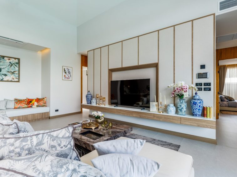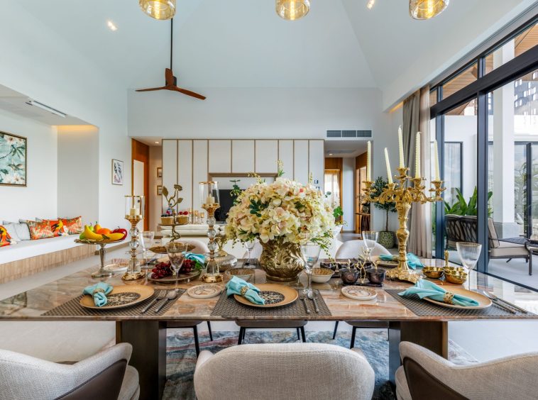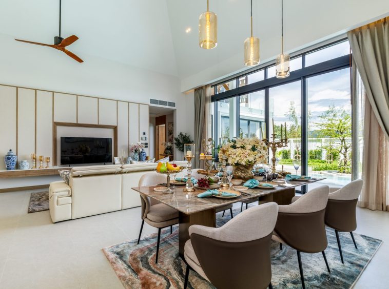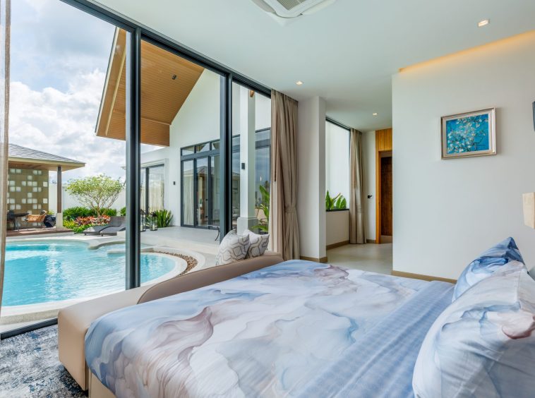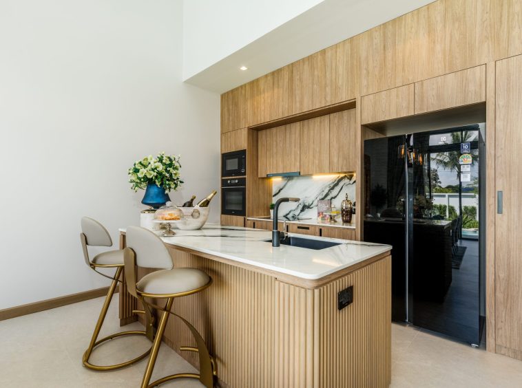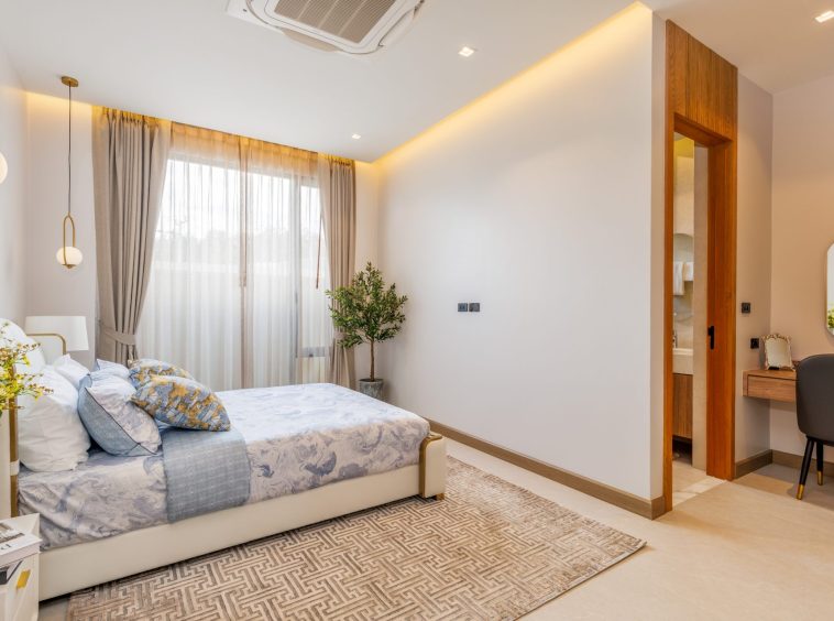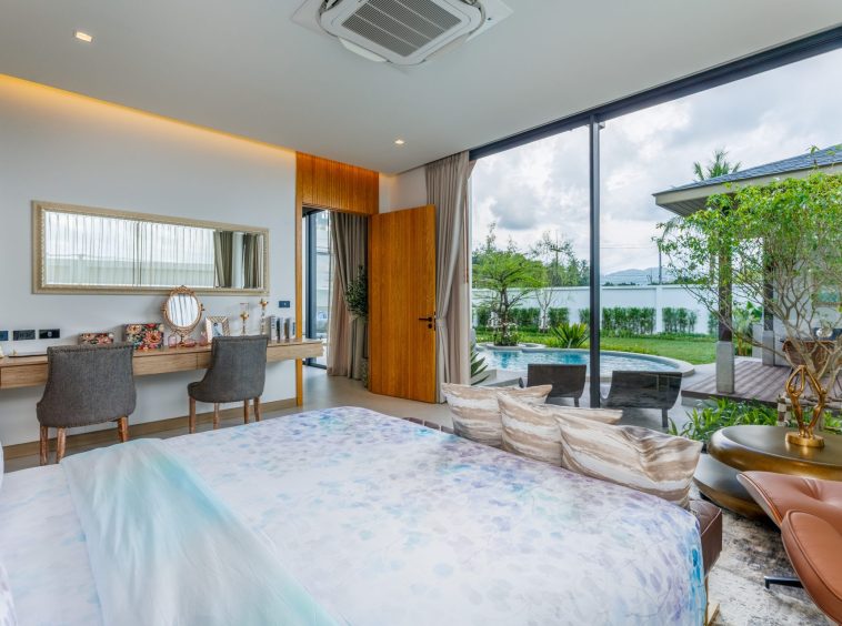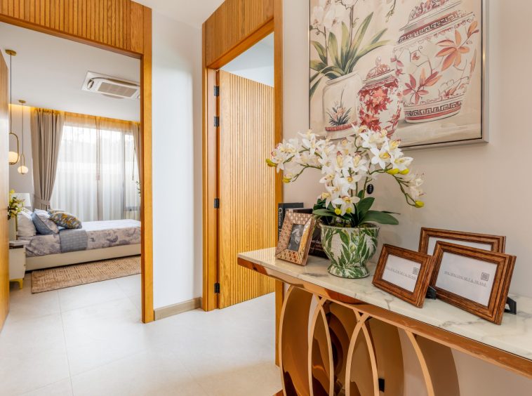 The villa’s design artfully incorporates iconic gabled roofs, reflecting the architectural heritage of Thailand’s Ayutthaya era. The interior flows effortlessly, allowing natural light to illuminate the open-plan living spaces. High-quality materials enhance the overall atmosphere, promoting a sense of calm and tranquillity within.