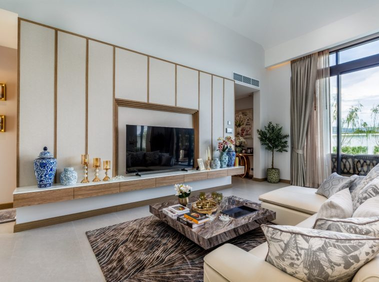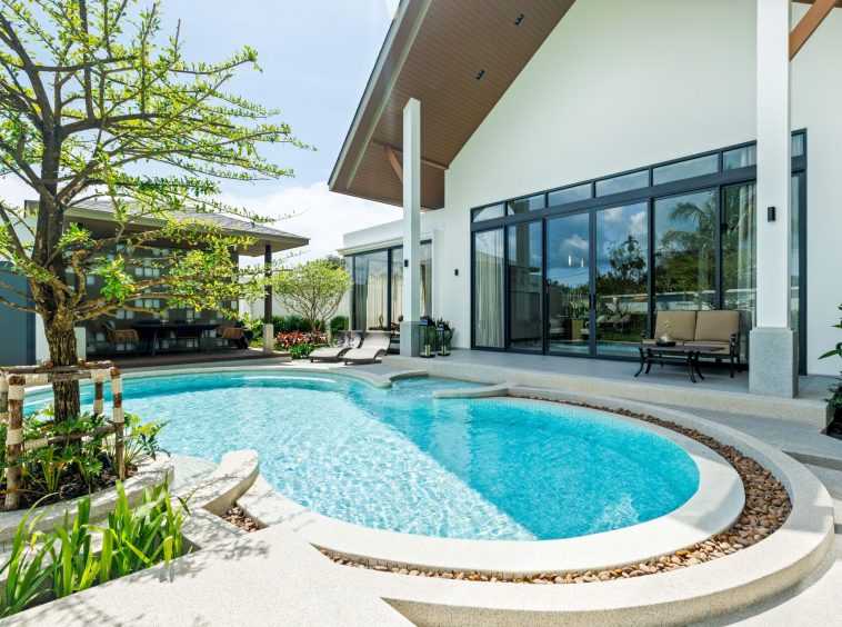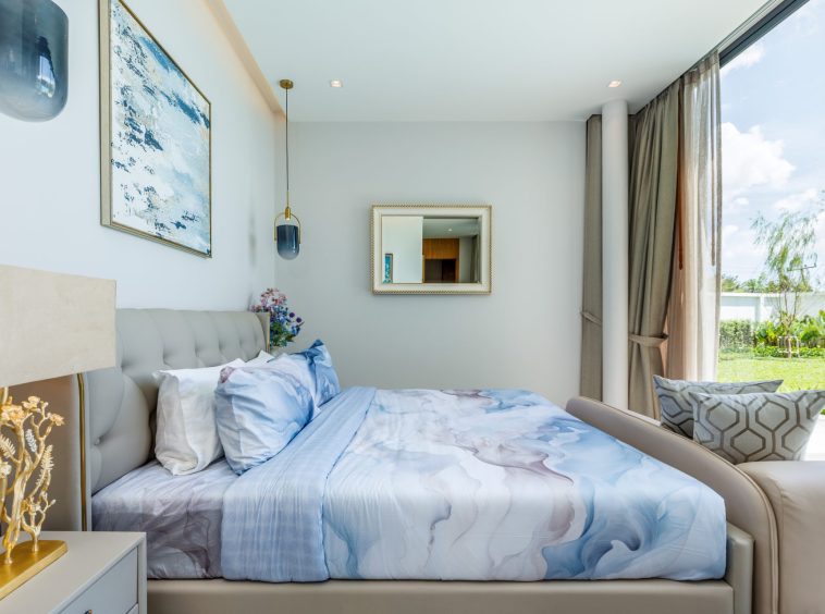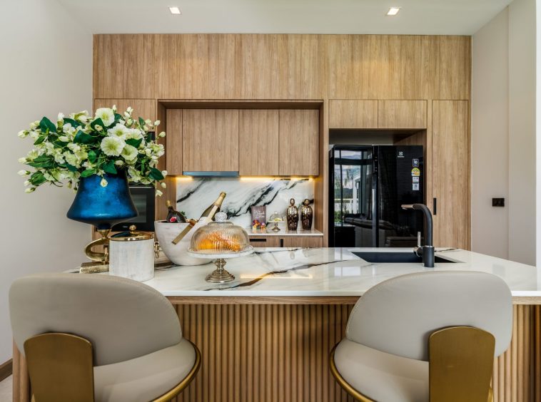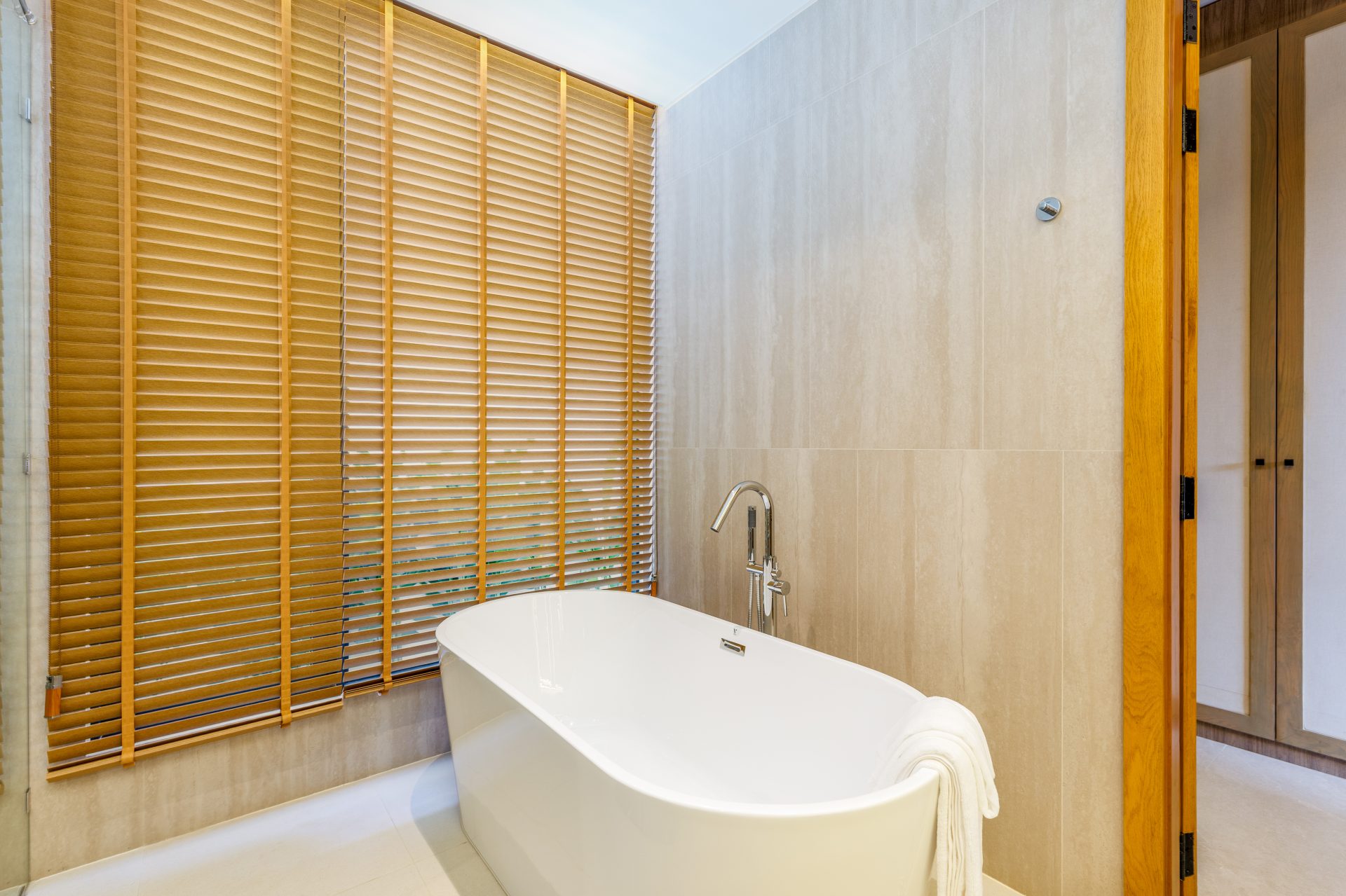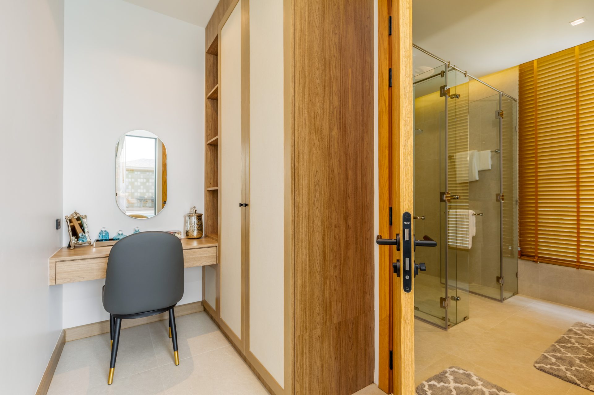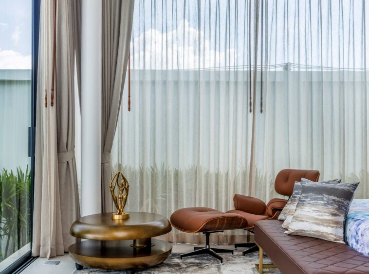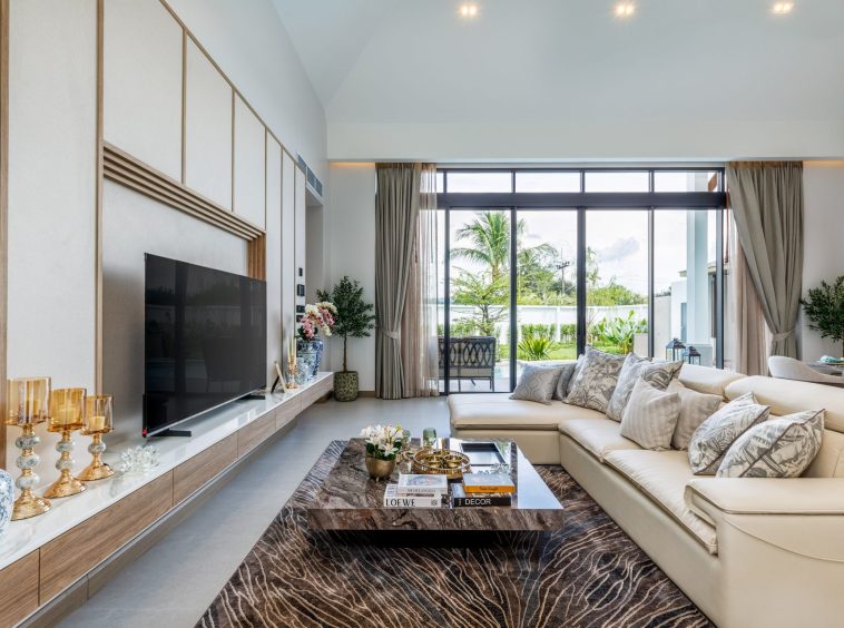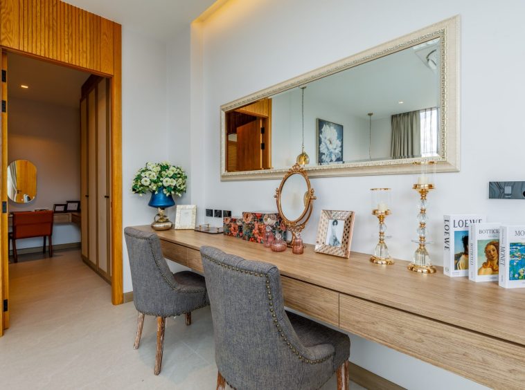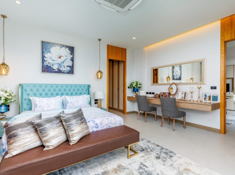 The villa’s design artfully incorporates iconic gabled roofs, reflecting the architectural heritage of Thailand’s Ayutthaya era. The interior flows effortlessly, allowing natural light to illuminate the open-plan living spaces. High-quality materials enhance the overall atmosphere, promoting a sense of calm and tranquillity within.