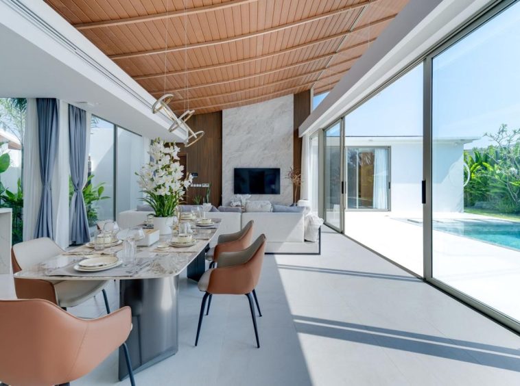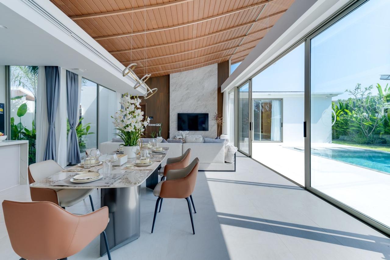 The open-plan living and dining area creates a bright and welcoming atmosphere. Large sliding glass doors connect the indoor space with the pool terrace, allowing fresh air and sunlight to flow throughout the home.