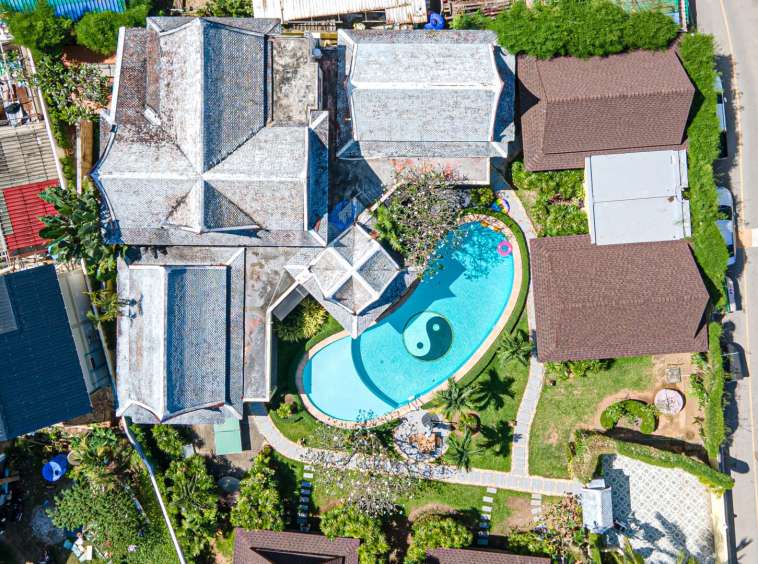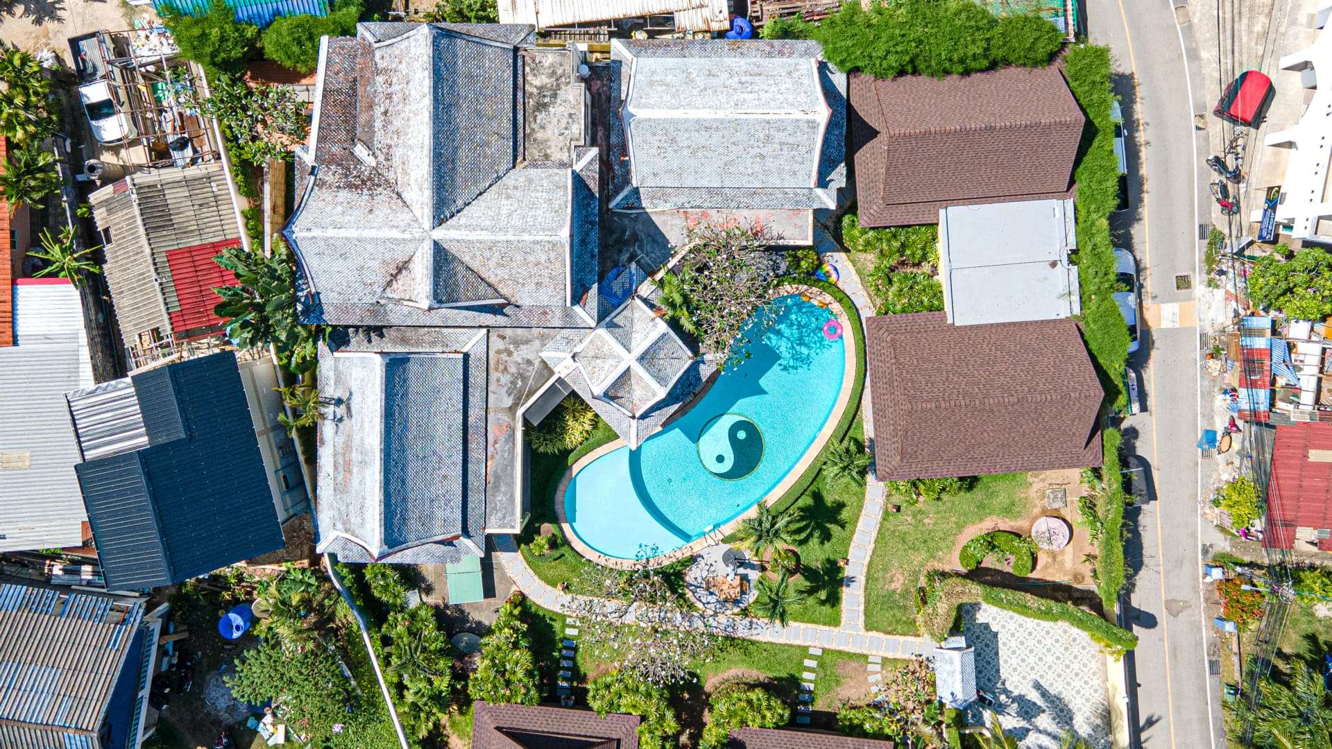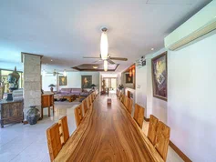 This luxurious villa showcases a Thai and Asian-inspired design, featuring six king-bed suites that surround a stunning yin & yang swimming pool. Each suite boasts air-conditioning, walk-in wardrobes, lounge areas, writing desks, ceiling fans, and TVs, offering comfort and convenience. The main living and dining areas are elegantly designed, featuring an open-plan layout that enhances connectivity and flow. Authentic furnishings from Thailand and Indonesia, along with Asian artworks and Buddha sculptures, create a warm, tranquil atmosphere that invites relaxation.