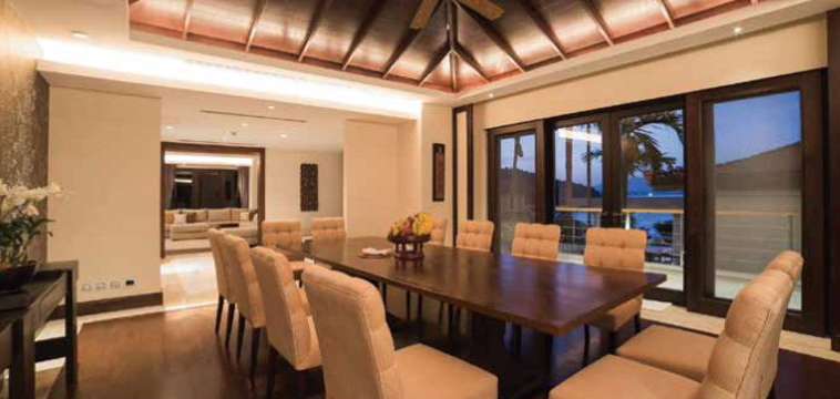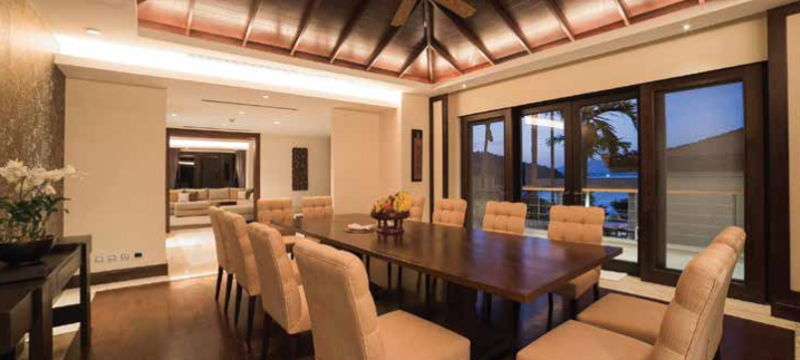 A beautiful living and dining pavilion leads outside over a teak bridge to the open-air dining pavilion and a separate lounge area surrounded by comfortable sofas. A few steps down from the dining areas are two individual freestanding guest bedrooms, each with its own eight-metre infinity pool.