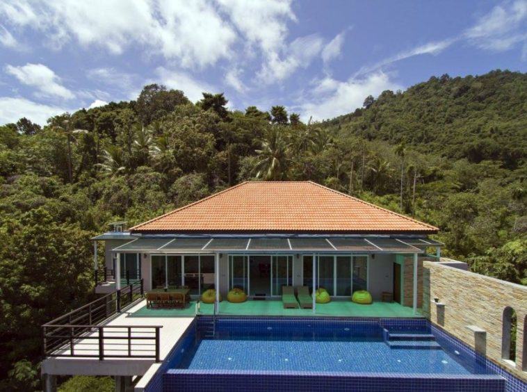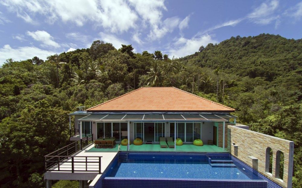 The villa sits atop a mountain and exudes a unique charm that reflects traditional Thai architecture with oriental accents. The living area is spacious and features a dining table, lounge, TV, desk, and a fully fitted western kitchen that opens onto the terrace with bay windows.